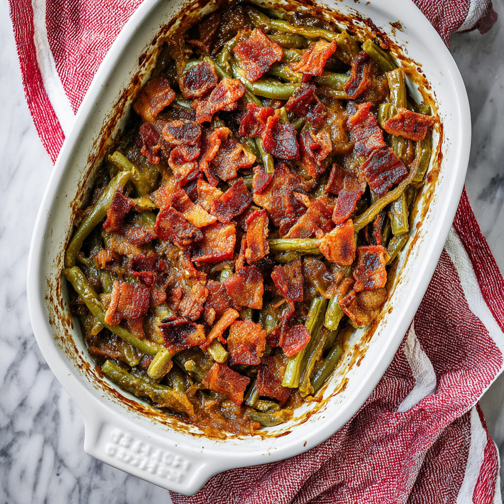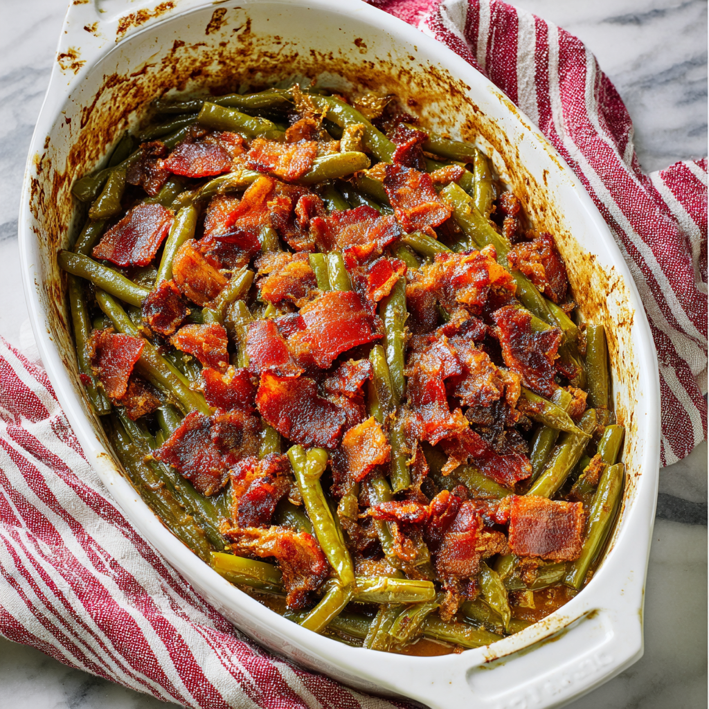 I first tasted these at a church potluck in Alabama, where they disappeared faster than any other dish on the table. At first glance, it’s hard to believe something so simple could taste so good, but the magic happens in the glaze. The brown sugar melts into the butter and soy sauce to form a sticky, caramelized coating that clings to every green bean. Add crispy bacon bits for a little texture and smoky depth, and you’ve got a side dish that’s impossible to stop eating.