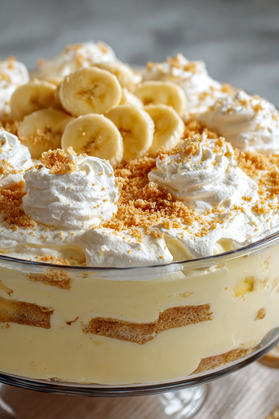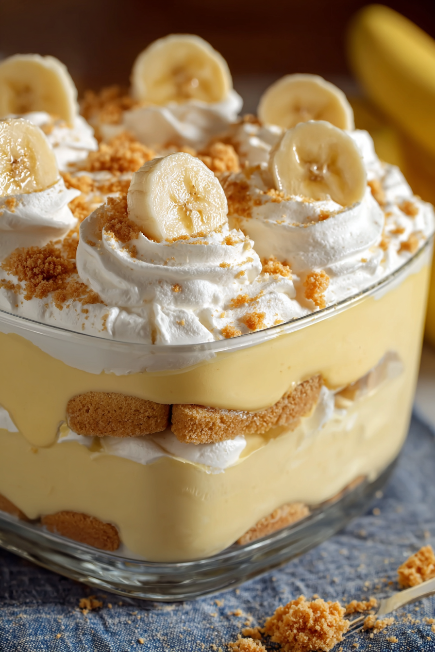 Fresh bananas are essential for that signature flavor. Sliced bananas are layered into the dish, offering freshness and natural sweetness. Finally, a sprinkling of crushed cookies or extra whipped topping on top adds the finishing touch, making each serving picture-perfect.