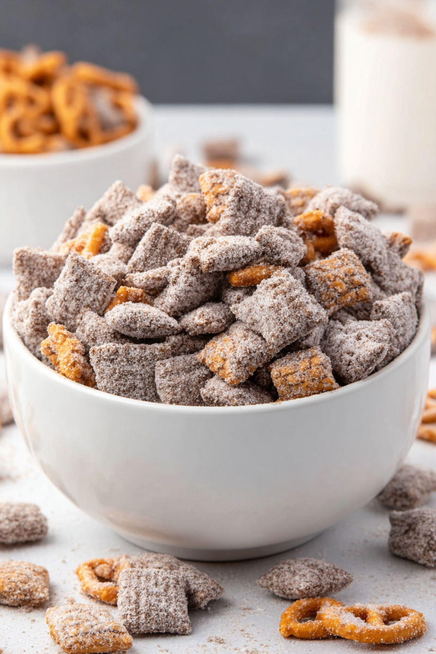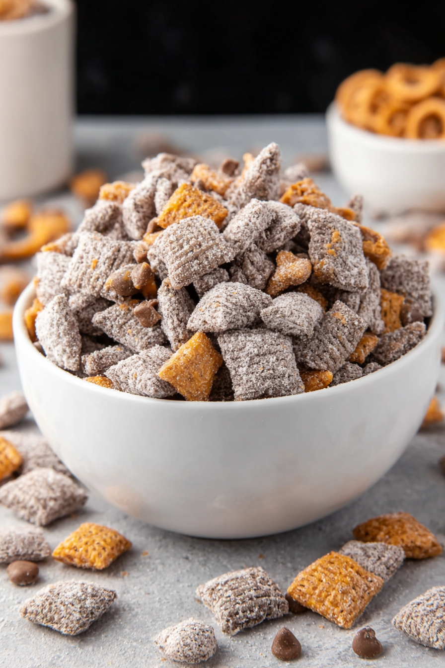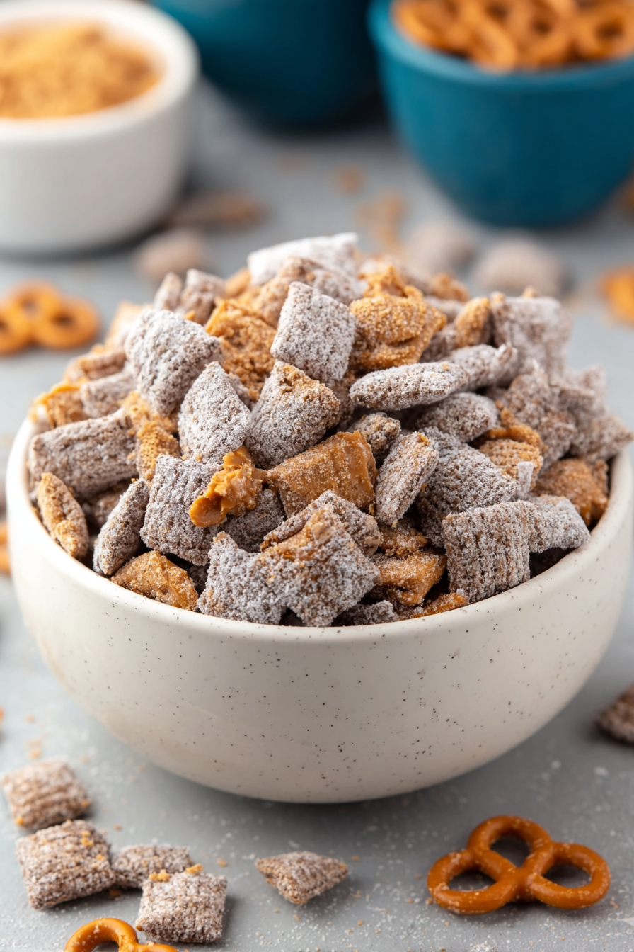 Powdered sugar: Though not in the base list above, powdered sugar is typically used to coat Puppy Chow, giving it that snowy look and ensuring the pieces don’t stick together.