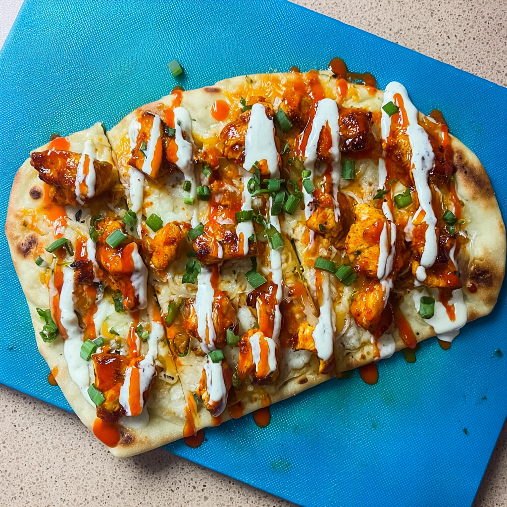 Swap the naan for your favorite gluten-free flatbread—many store-bought varieties crisp nicely in the oven. Just keep an eye on baking time since gluten-free breads can brown faster. Everything else in the recipe is naturally gluten-free, but do double-check your Buffalo sauce and ranch labels for hidden gluten.