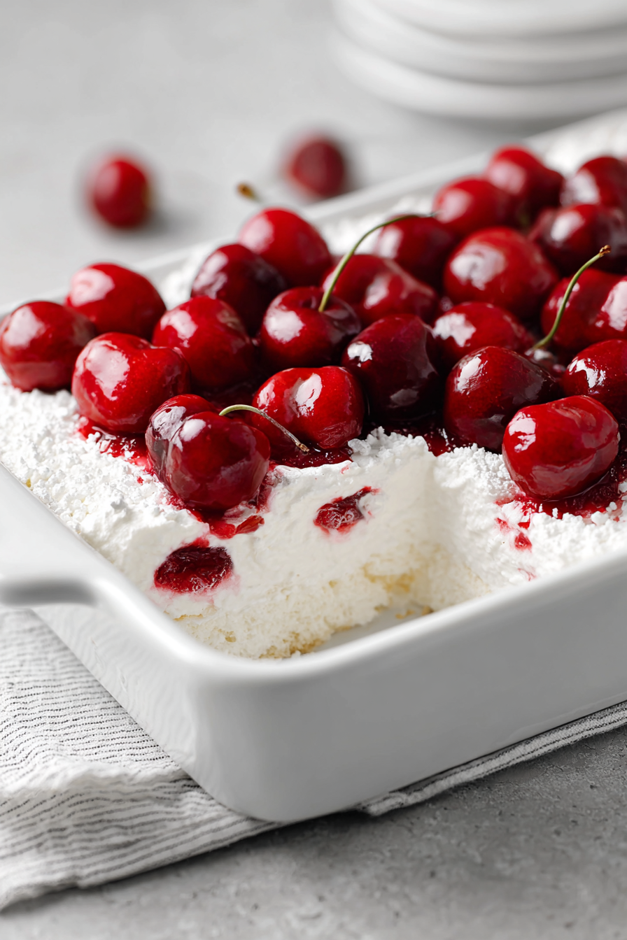 A creamy, dreamy no-bake dessert with layers of sweetened cream cheese, fluffy cake cubes, and a luscious cherry topping. Perfect for gatherings and holidays.