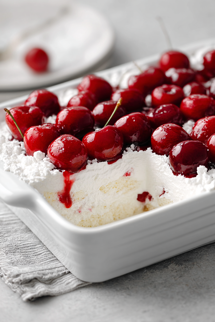 Cherries in the Snow is best enjoyed fresh, but it can be made ahead for convenience. Store leftovers tightly covered in the refrigerator for up to 3 days. The cake may soften slightly as it absorbs the cream mixture, but that only enhances its texture. Freezing is possible, though the cream cheese mixture may lose some of its smoothness after thawing. If freezing, wrap tightly in plastic wrap and aluminum foil, and consume within one month. For make-ahead preparation, assemble the layers the night before serving and refrigerate until ready to wow your guests.