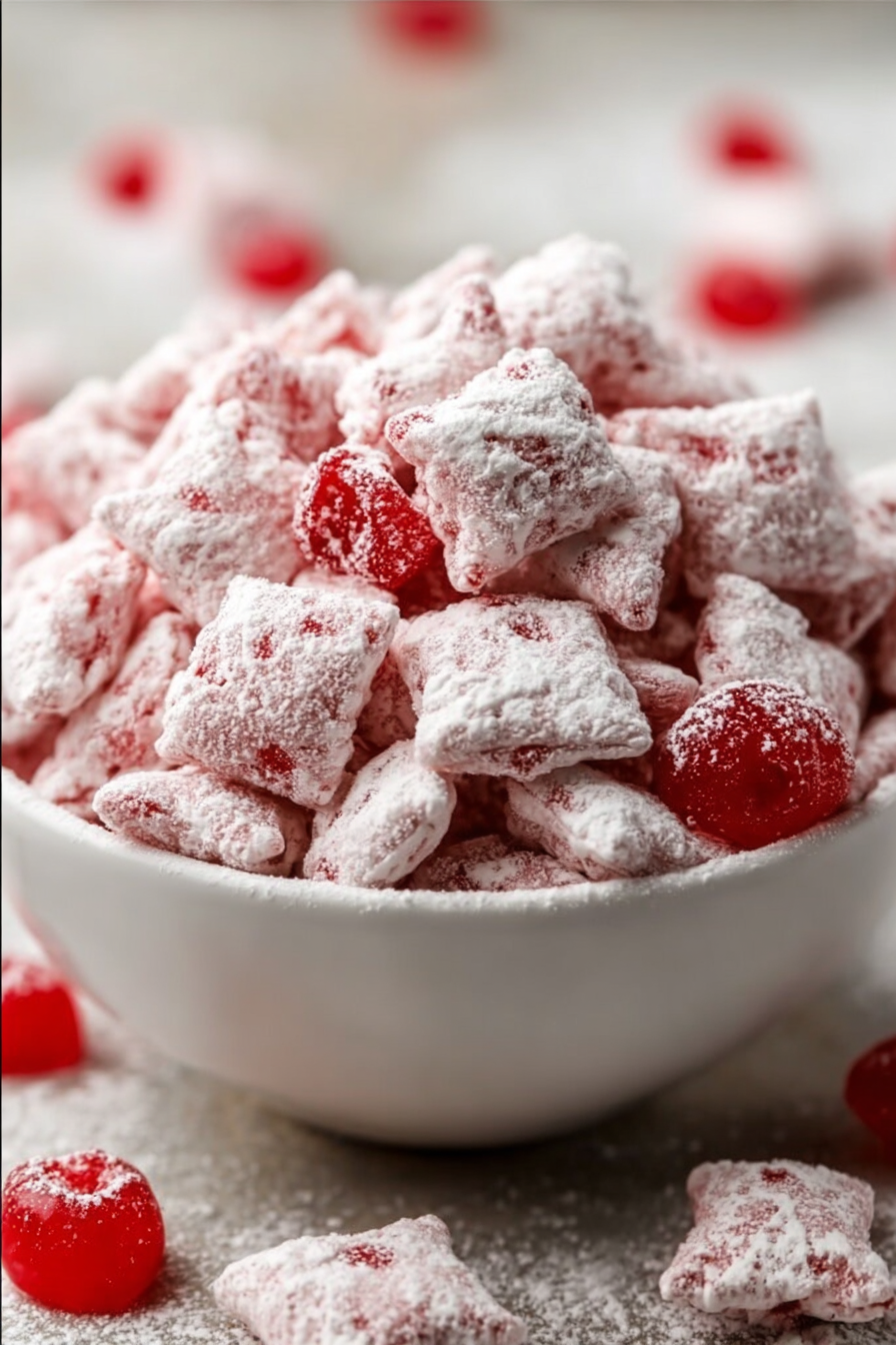 A sweet, crunchy snack mix made with Chex cereal, white chocolate, and powdered sugar for a cheesecake-inspired treat with a cherry twist. Perfect for parties or gifting!