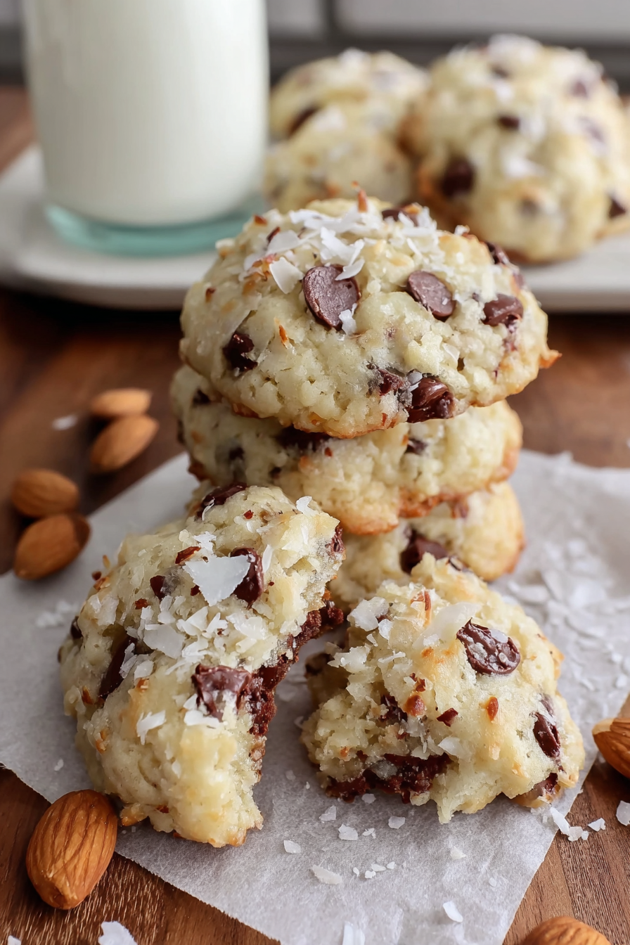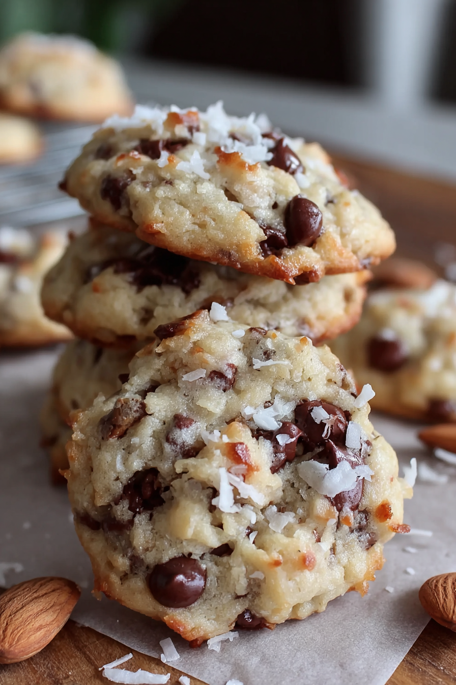 Soft, chewy cookies packed with coconut, almonds, and chocolate chips—just like the classic candy bar. A perfect treat for cookie lovers.