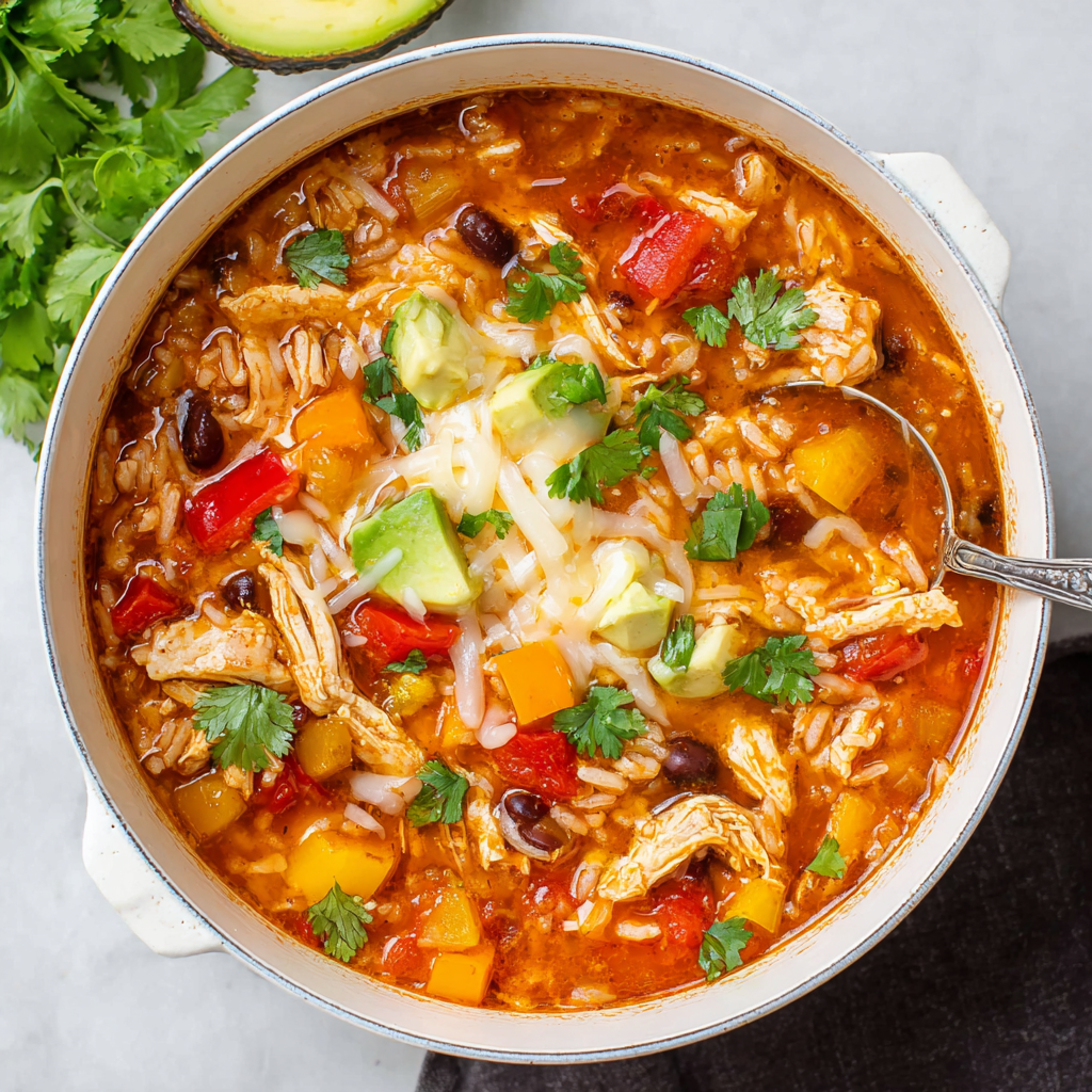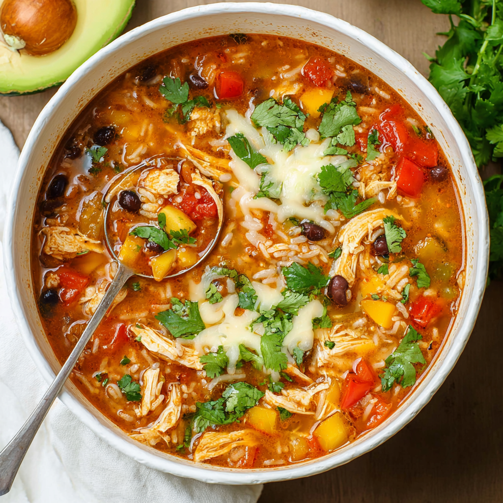 Bold, hearty Chicken Fajita Soup loaded with peppers, rice, spices, and cheese. A cozy, flavorful one-pot meal your family will love.