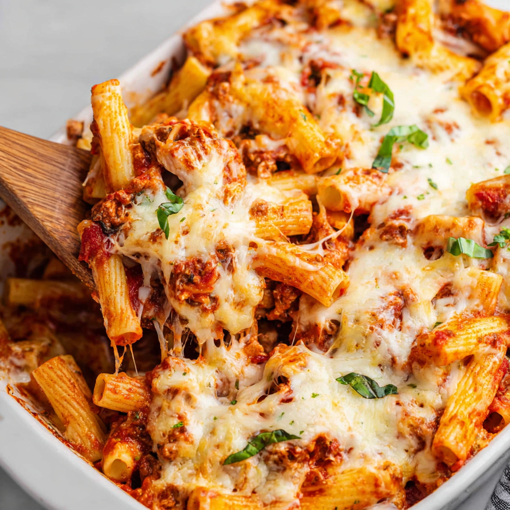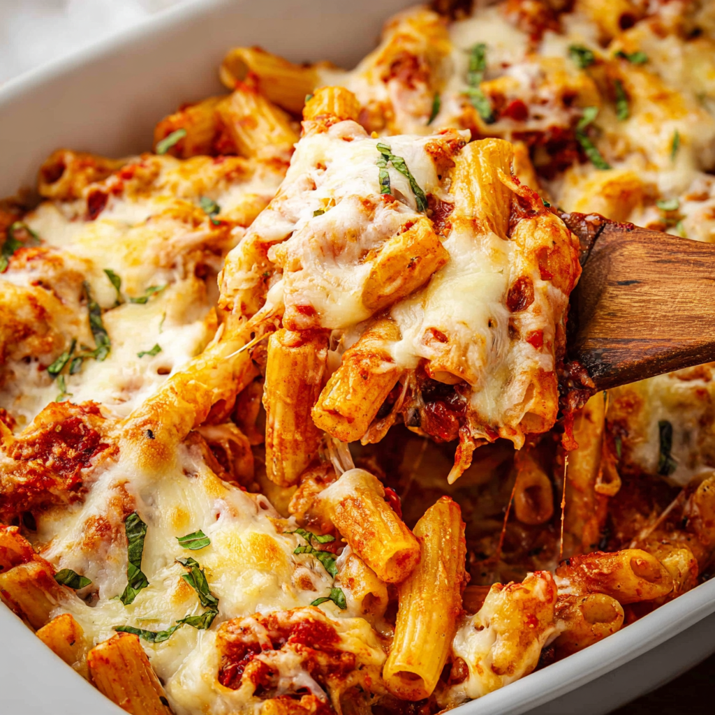 Its versatility allows for creative adaptations, whether you want to go vegetarian, make it dairy-free, or add extra flavor with fresh herbs and seasoning. The baked ziti can be made ahead, frozen for later, or enjoyed as leftovers without losing its quality, making it practical as well as delicious. Every bite delivers the perfect balance of textures—tender pasta, crispy chicken, and melty cheese—while the optional fresh basil adds a pop of color and freshness that elevates the dish.