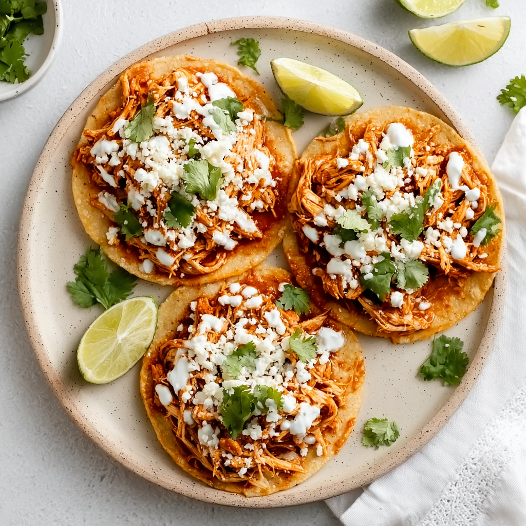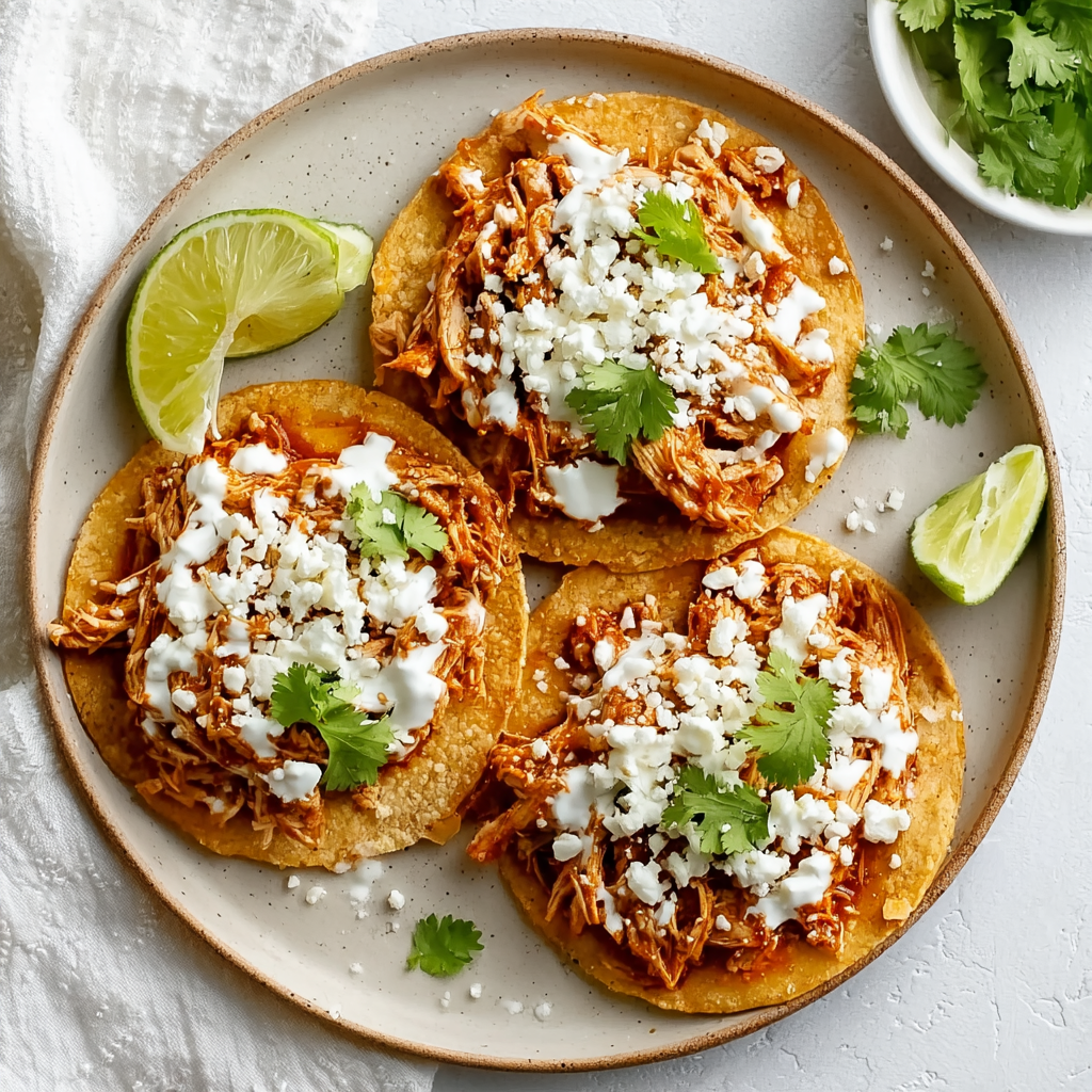 These Chicken Tinga Tacos feature smoky chipotle-tomato shredded chicken tucked into warm corn tortillas, topped with avocado, cotija, cilantro, and lime. A perfect mix of spice, freshness, and comfort for any night of the week.