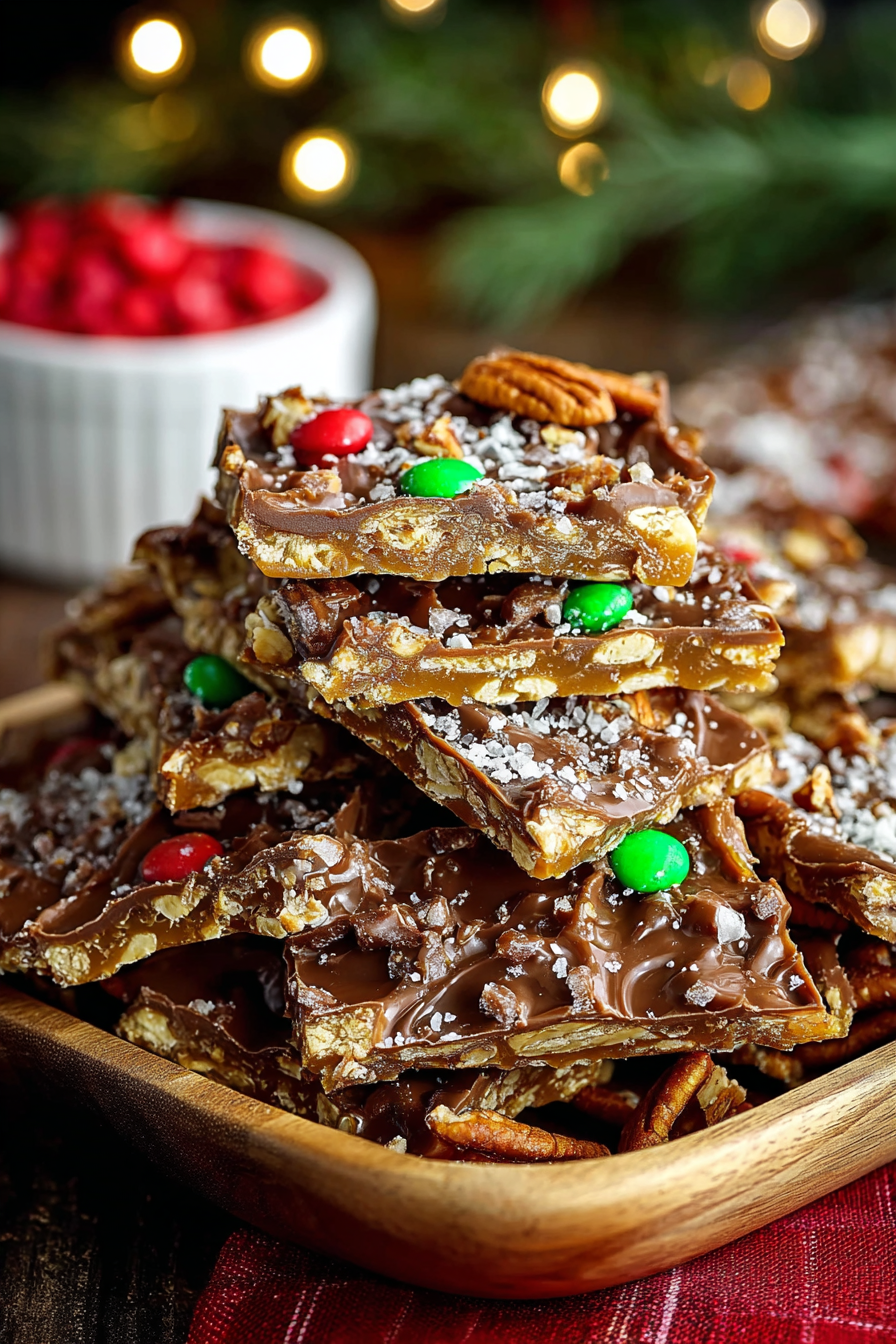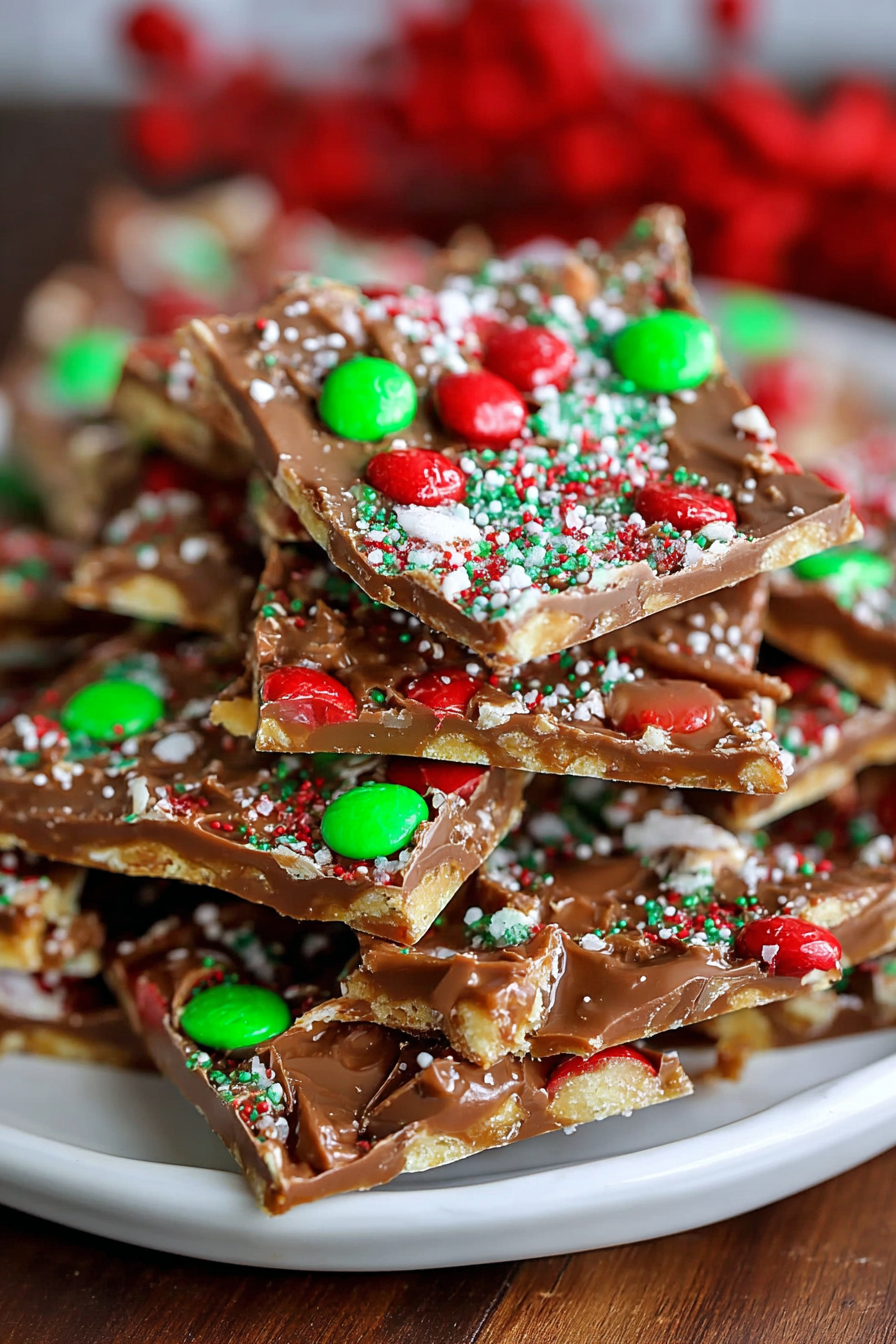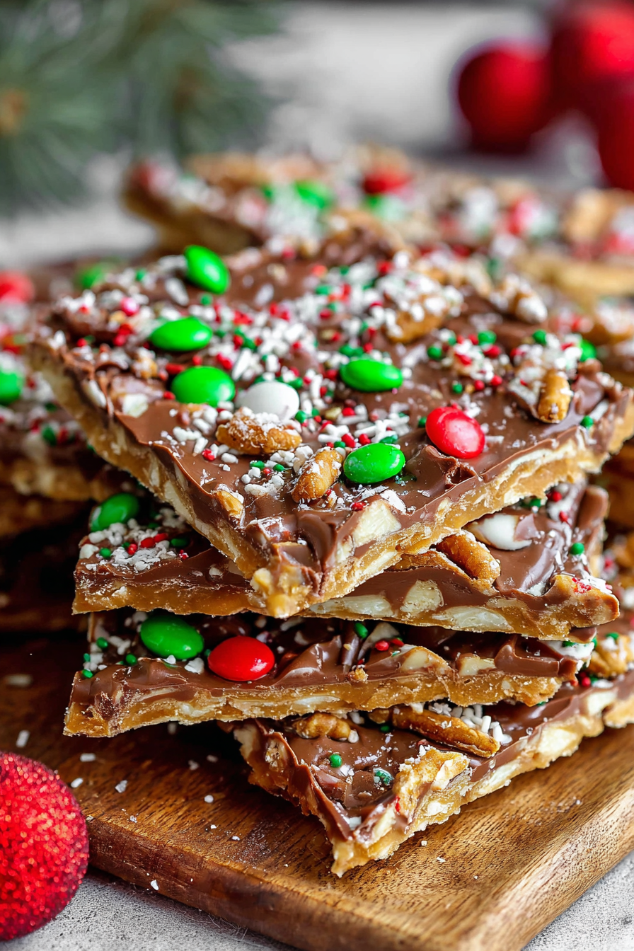 Christmas Crack is delightful on its own, but it also shines when paired with other holiday goodies. Serve it on a festive cookie tray alongside sugar cookies, gingerbread men, or fudge for a beautiful variety. It pairs perfectly with a hot mug of cocoa, coffee, or spiced apple cider. For gifting, package pieces in clear cellophane bags tied with ribbon or in decorative tins. It’s a sweet gesture that never fails to brighten someone’s day. For a more elegant dessert spread, serve Christmas Crack with fresh fruit and cheese for a sweet-and-savory balance.
