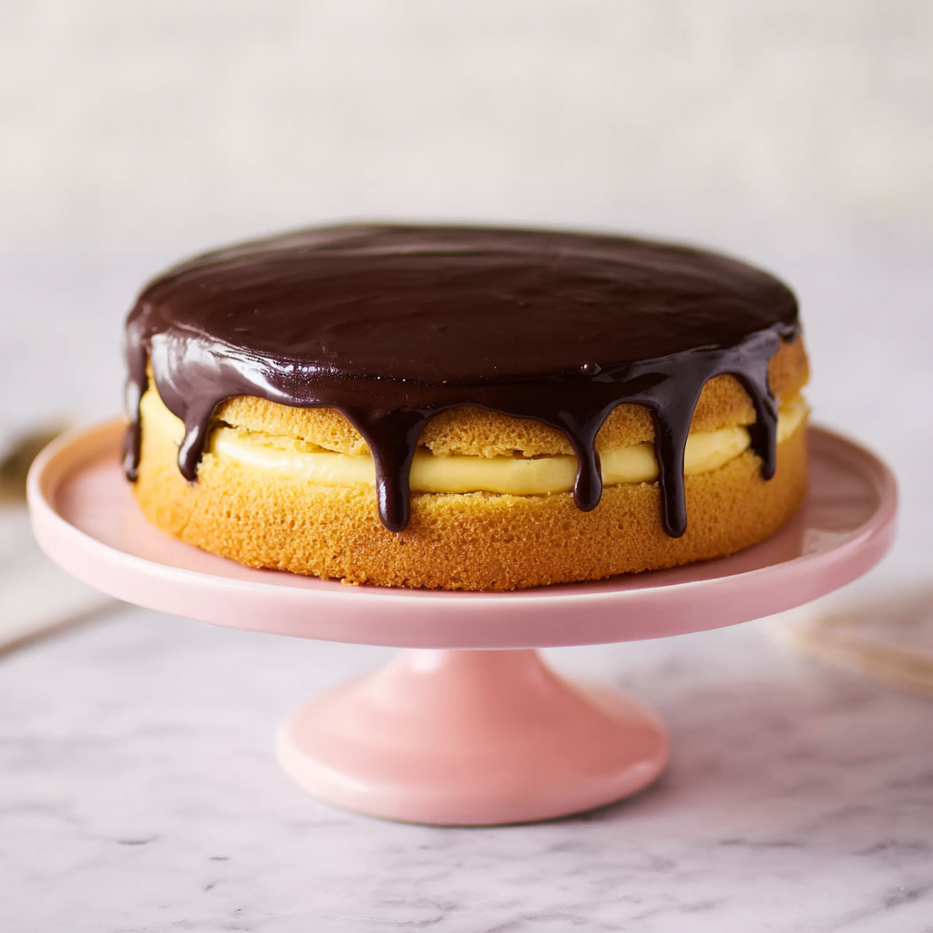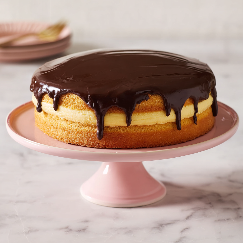 A traditional Boston Cream Pie Recipe featuring soft sponge cake, vanilla pastry cream, and rich chocolate glaze.
