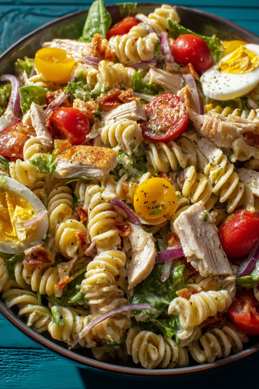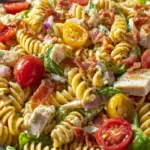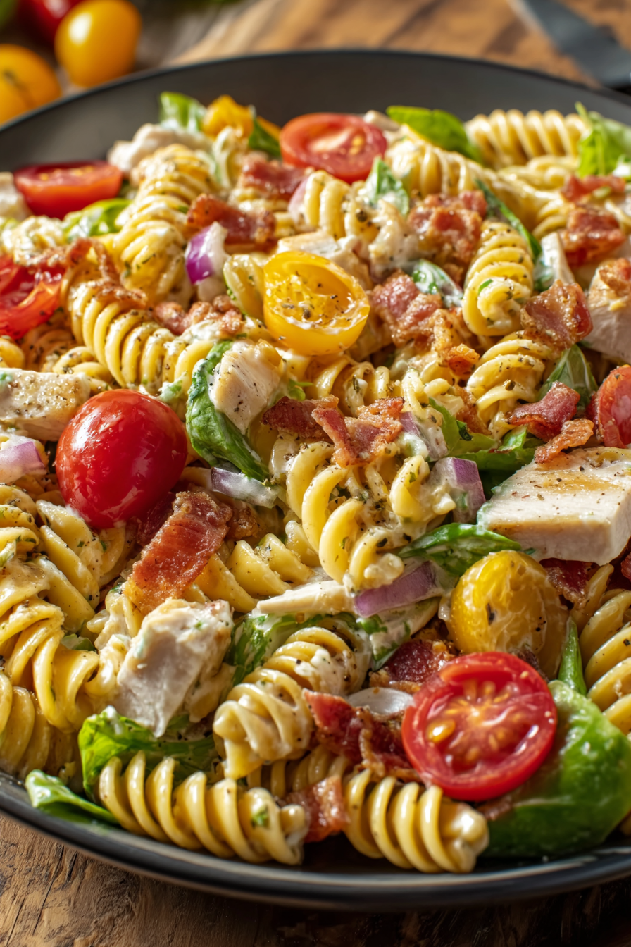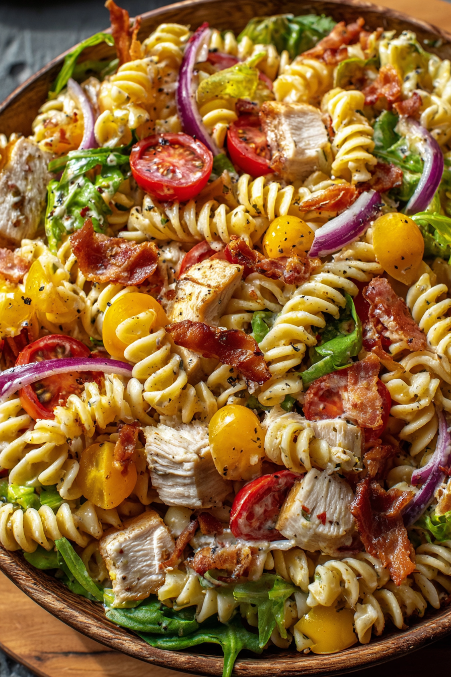 This recipe was inspired by my love of both deli sandwiches and summer pasta salads. I’ve always enjoyed making traditional club sandwiches layered with juicy chicken, smoky bacon, crisp lettuce, and tomatoes. One day, while preparing a pasta salad for a barbecue, I decided to combine the two. The result was a hearty, colorful dish that my family devoured instantly. Over time, I refined the recipe, adjusting the pasta-to-protein ratio, balancing the creaminess of the dressing, and adding just the right amount of bacon for a smoky crunch. Now, this has become a staple dish in my kitchen whenever I need something easy yet impressive.