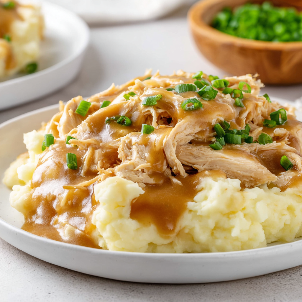 With just a handful of pantry staples—cream of chicken soup, gravy mix, black pepper, garlic powder, and bouillon—you can throw everything together in minutes. The chicken cooks low and slow until it’s fall-apart tender, soaking up every bit of that rich, flavorful sauce. A sprinkle of green onions on top adds freshness and color.