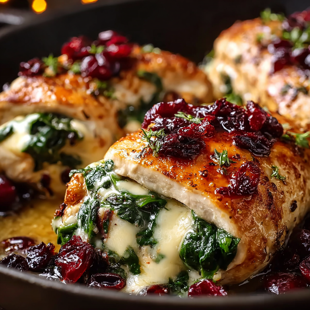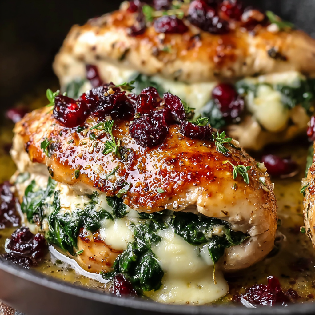 - Layer spinach, cranberries, and brie slices inside each breast.