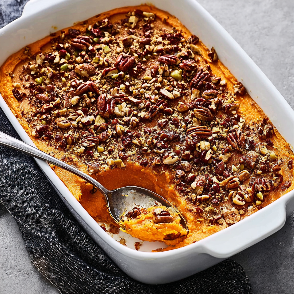This Sweet Potato Casserole blends velvety mashed sweet potatoes with a crisp, nutty topping made from pecans, pepitas, almond flour, and dates. It’s buttery, aromatic, and perfectly seasoned with cinnamon, nutmeg, and vanilla — a true crowd-pleaser for any holiday table or comforting weeknight dinner.