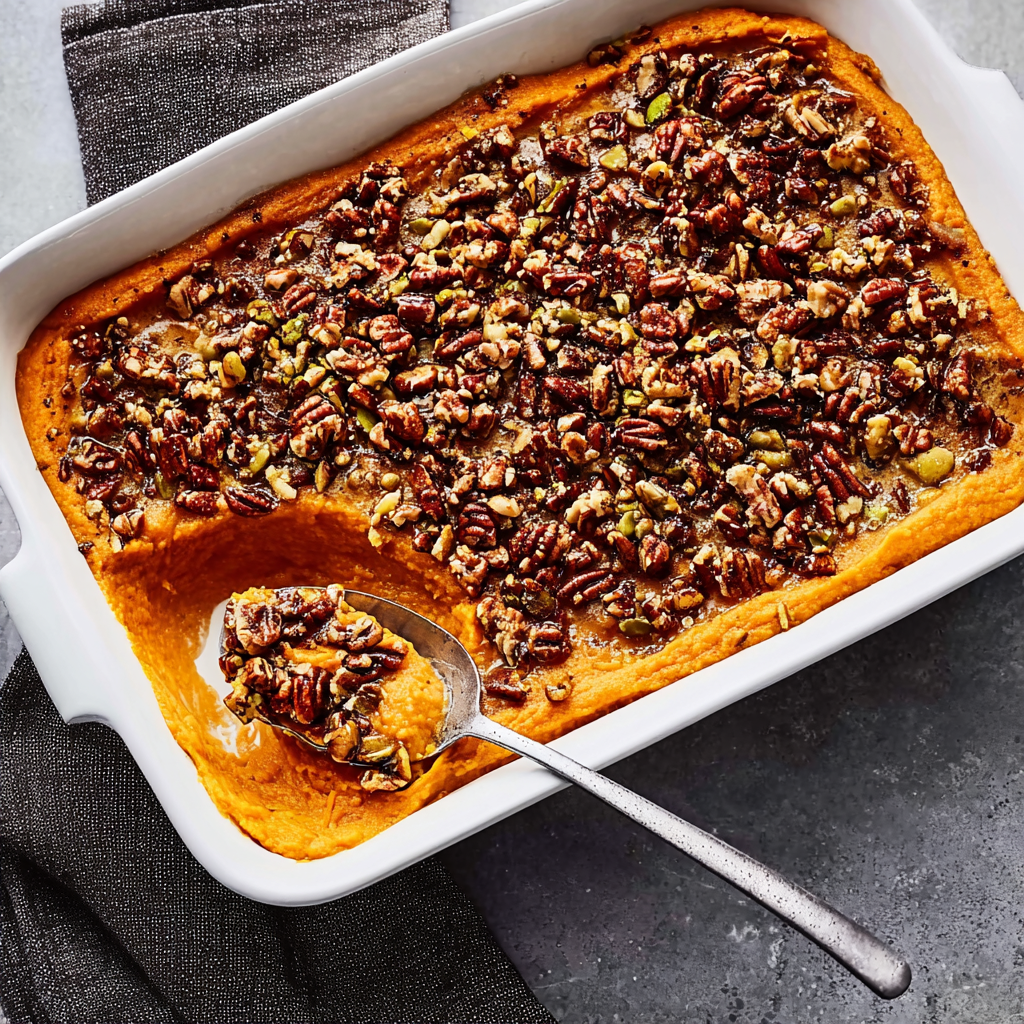 The magic of this Sweet Potato Casserole lies in its perfect balance — creamy, spiced sweet potatoes crowned with a crunchy topping of pecans, pepitas, and dates. It’s rich without being heavy, sweet without being cloying. Each bite brings together buttery smoothness and a nutty, caramelized crunch that feels like autumn on a plate.