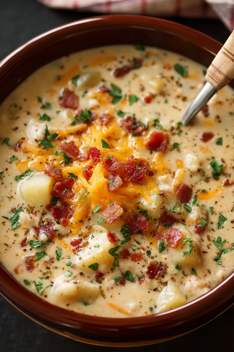 Cheddar cheese is another key ingredient, adding sharpness and richness to the soup. I always suggest shredding your own cheese instead of buying pre-shredded, as freshly grated cheese melts much smoother. The bacon provides smoky, salty crunch and is the perfect complement to the creamy potatoes. Combined with a touch of ranch-style seasoning or herbs, this soup hits every flavor note—savory, creamy, smoky, and cheesy. The beauty of this dish lies in how humble ingredients can come together to make something truly indulgent.