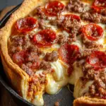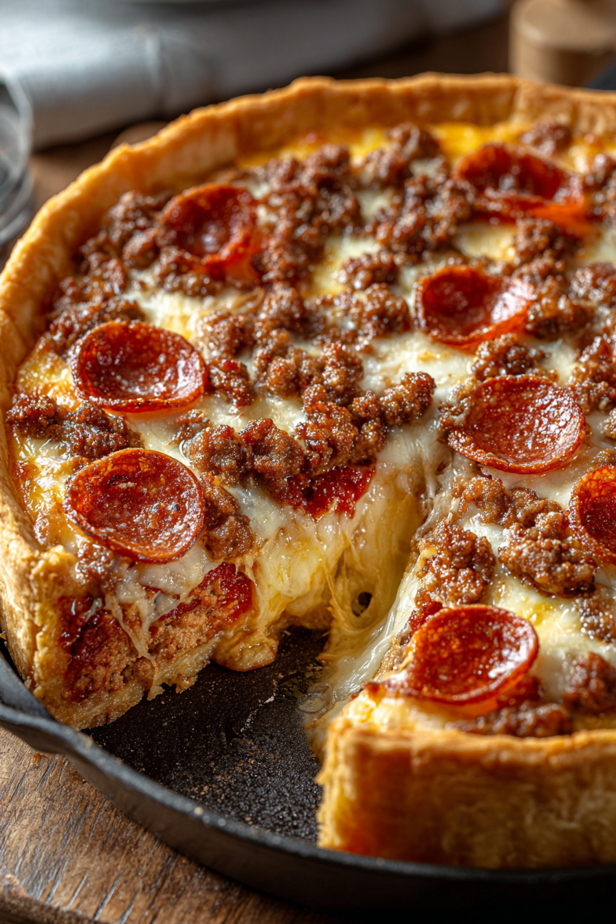 The idea for this recipe came from a family pizza night where everyone wanted something a little different—some wanted a classic pizza, others craved a hearty casserole. Instead of choosing one or the other, I decided to merge the two into a single dish that satisfied everyone. The first version was a hit, and over time I perfected it with layers of seasoned beef, crumbled Italian sausage, tangy tomato sauce, smoky pepperoni, and loads of cheese. What makes this pie special is its depth—literally. Each slice feels indulgent and comforting, with textures and flavors stacked beautifully together.