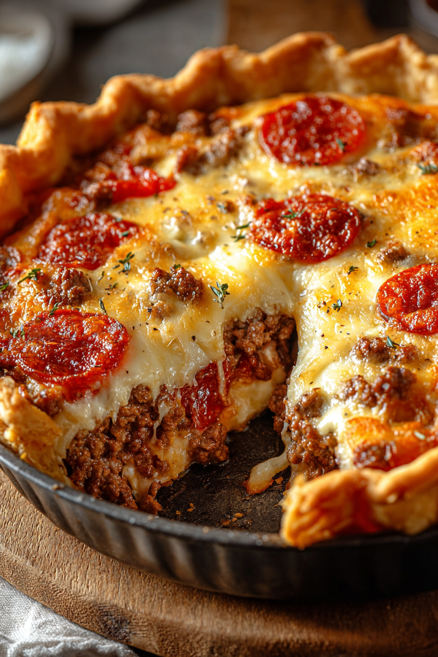 A hearty, savory pie layered with ground beef, Italian sausage, pepperoni, and gooey mozzarella cheese. Perfect for family dinners or potlucks.