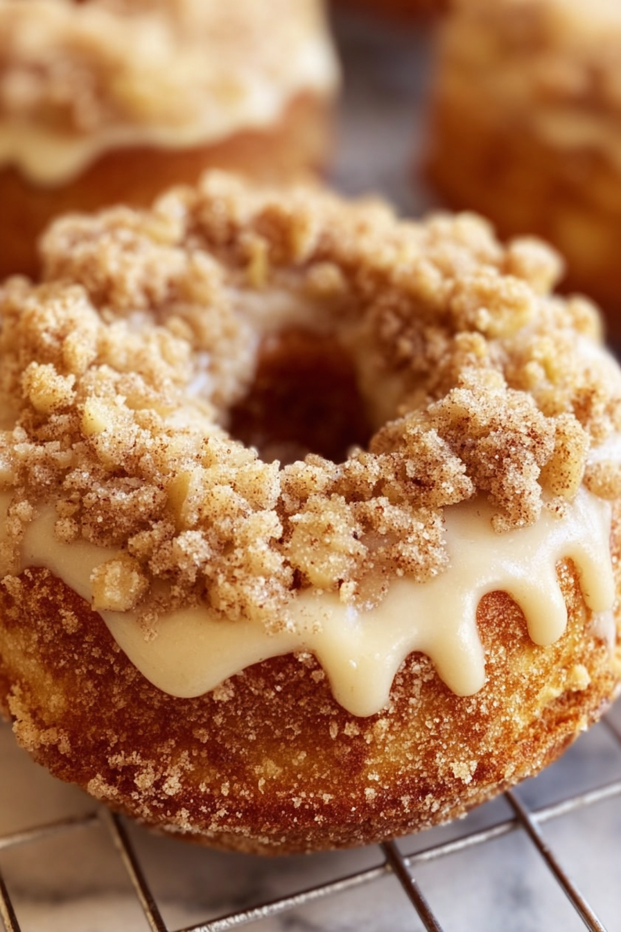 - Sprinkle the crumb topping evenly over each donut, pressing lightly to help it stick.