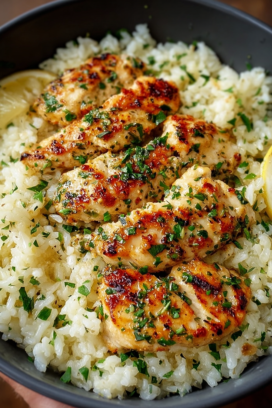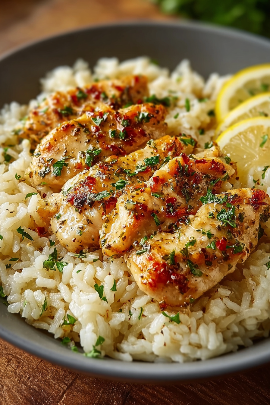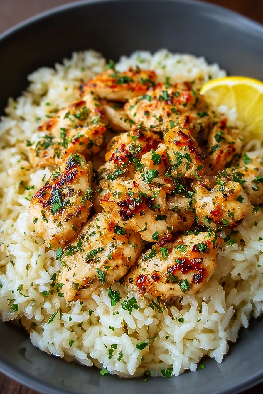 Tender chicken strips simmered in a rich garlic butter sauce, served over creamy parmesan rice for a comforting, restaurant-style dinner. Perfect for weeknights or special occasions.