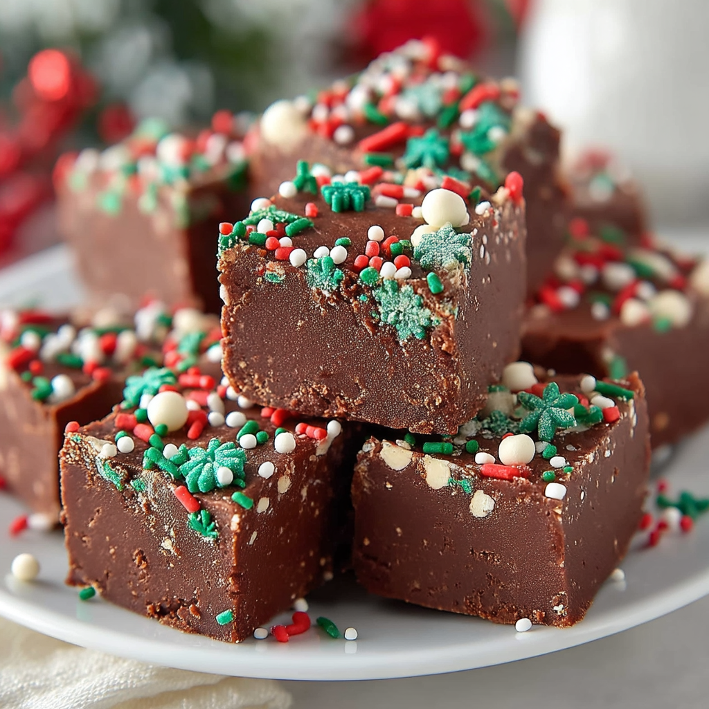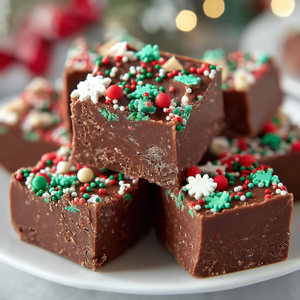 The base of this recipe is a simple mixture of sweetened condensed milk, semi-sweet chocolate chips, and butter. A dash of vanilla adds depth, while holiday sprinkles on top give it that unmistakable Christmas cheer. Whether you’re filling a dessert tray, assembling homemade treat boxes, or satisfying a late-night sweet tooth, this recipe works every time.