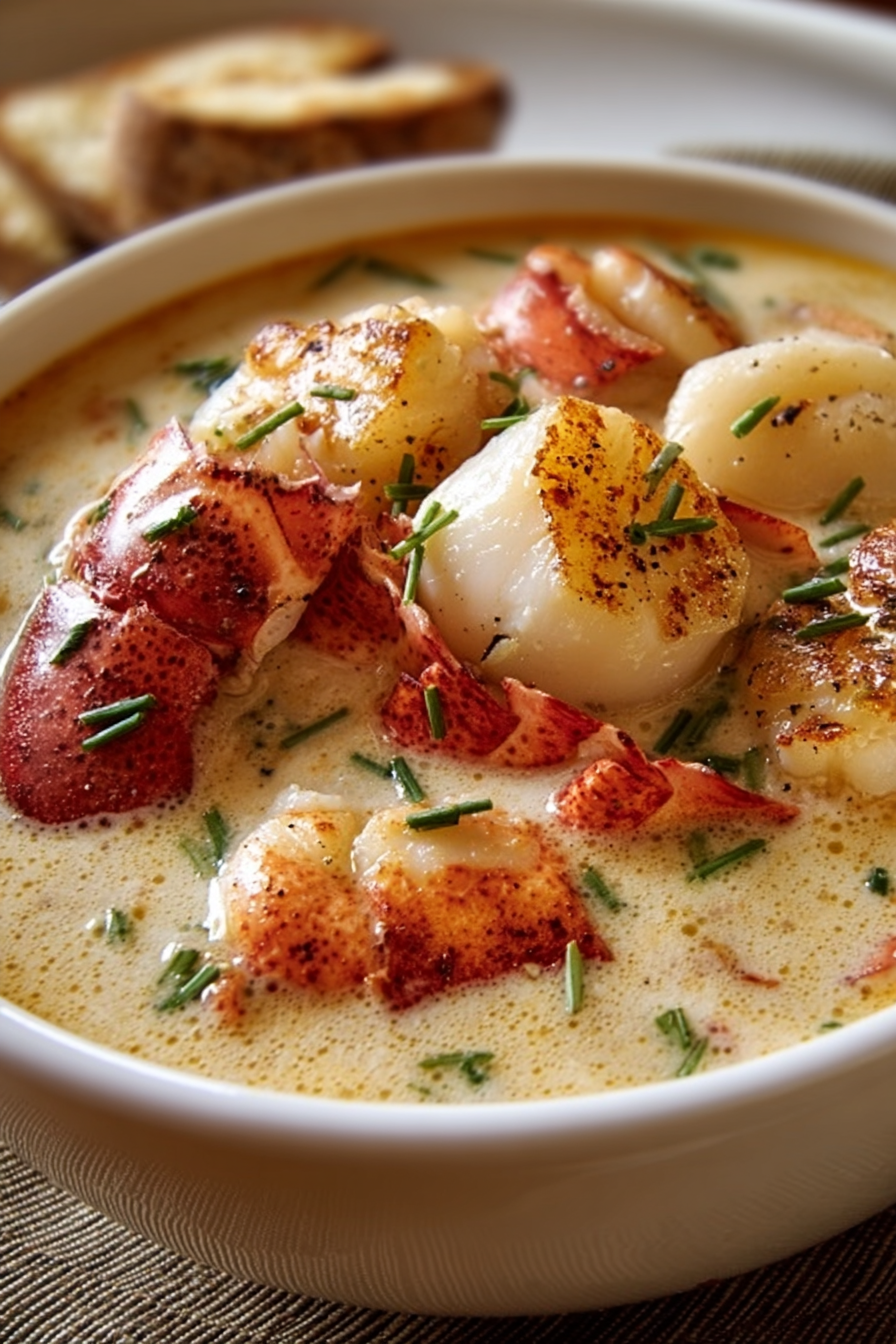 A luxurious and creamy seafood chowder filled with tender lobster and scallops, perfect for cozy nights or elegant dinners.