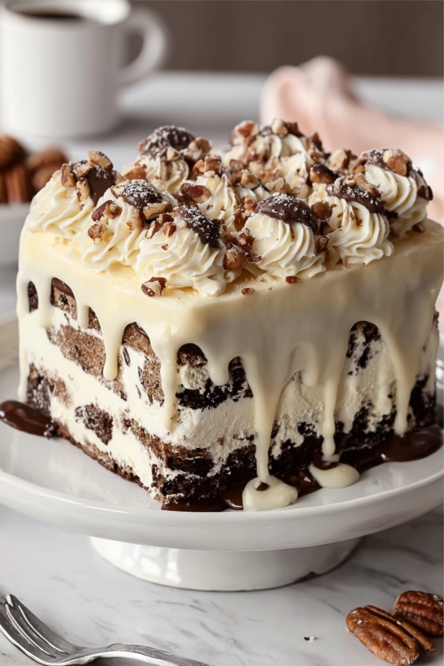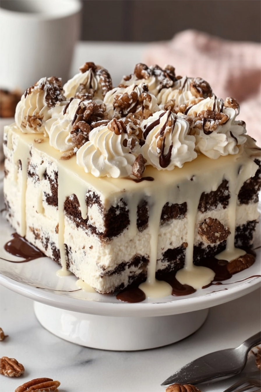 - Spread the frosting evenly over the cooled pineapple-topped cake. Garnish with pecans, coconut, or cherries if desired. Slice and serve.