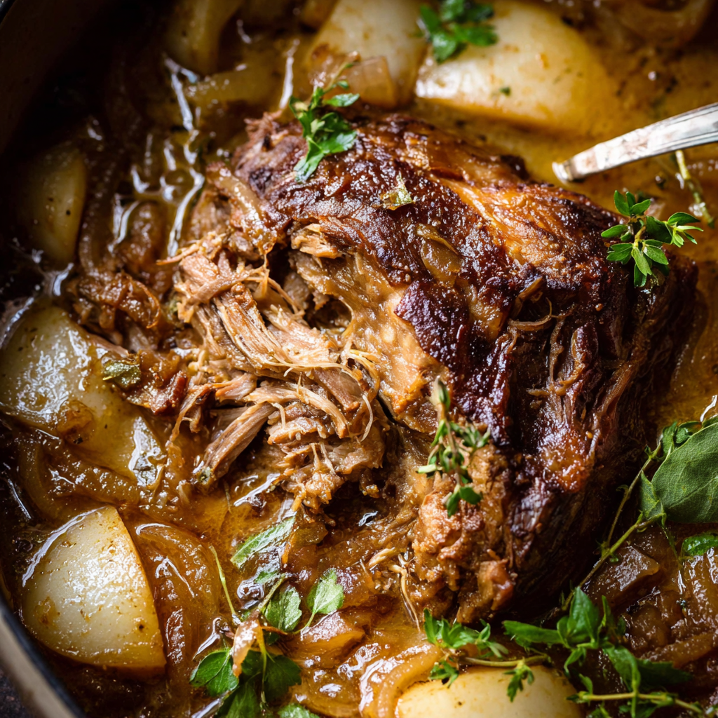 This Apple Cider Braised Pork Shoulder is a cozy, slow-cooked dish where tender pork shoulder is simmered in apple cider, chicken stock, mustard, garlic, and herbs. The result is a flavorful roast with a balance of savory, sweet, and aromatic notes — perfect for family gatherings or fall dinners.