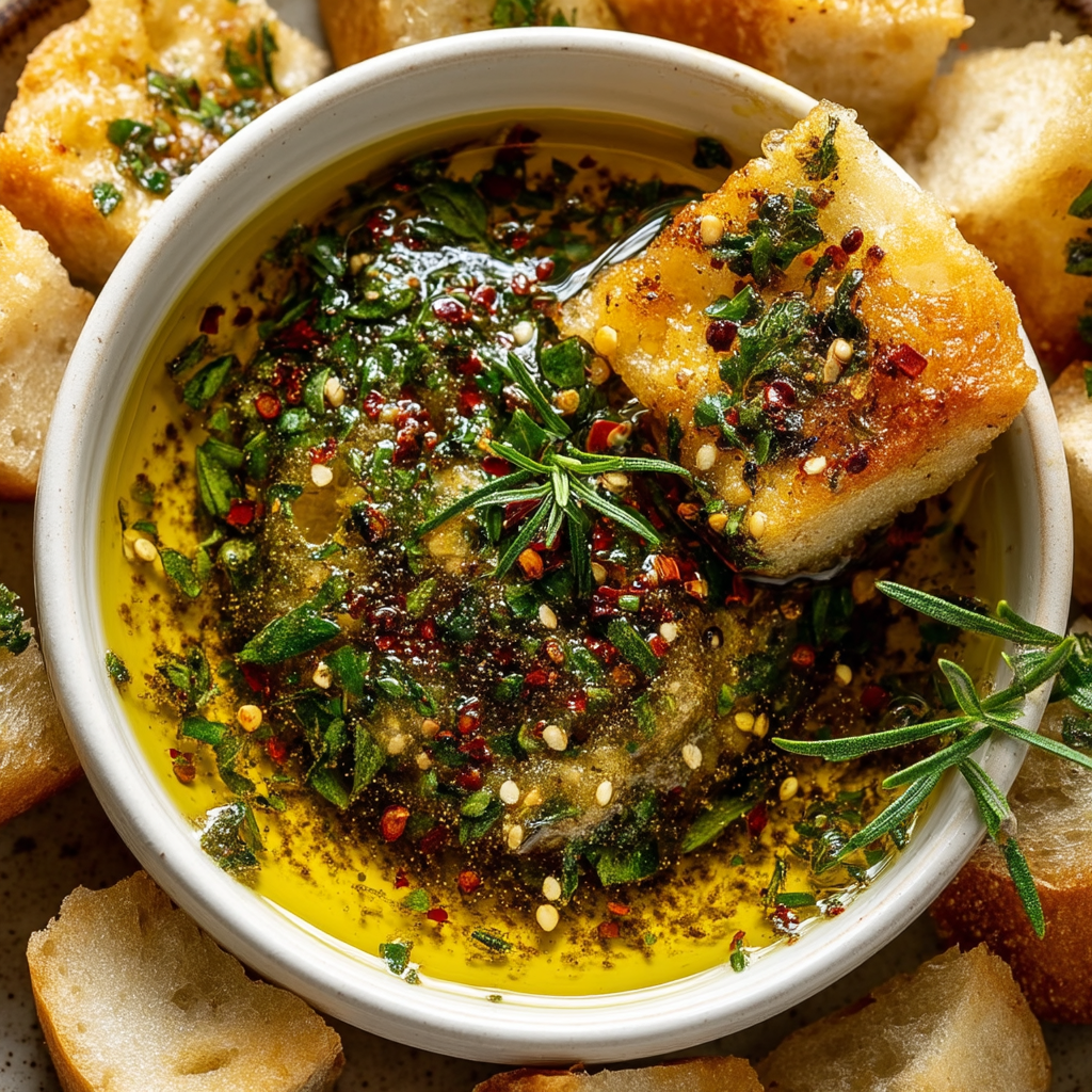 Infuse your olive oil with aromatics like garlic, rosemary, or lemon peel by gently warming for 10 minutes, then straining. It adds depth and subtle complexity to the final dip.