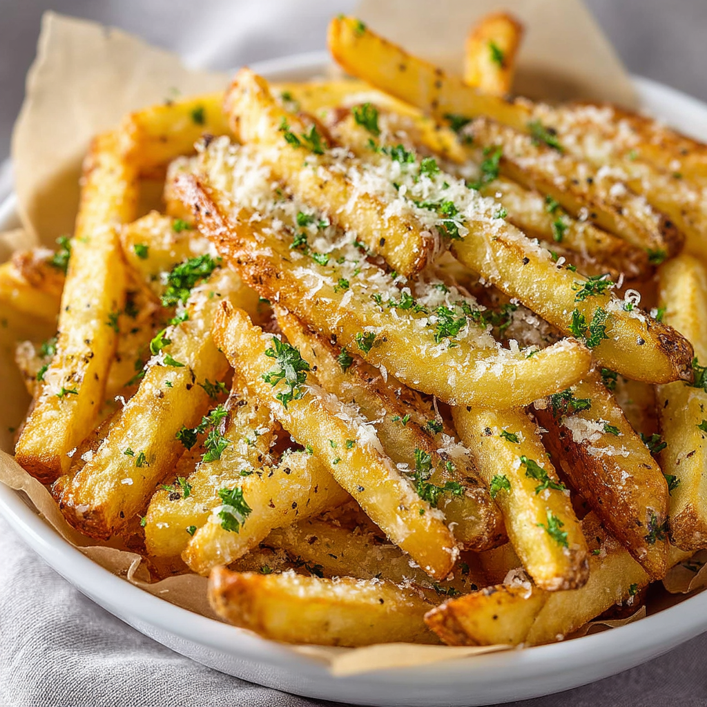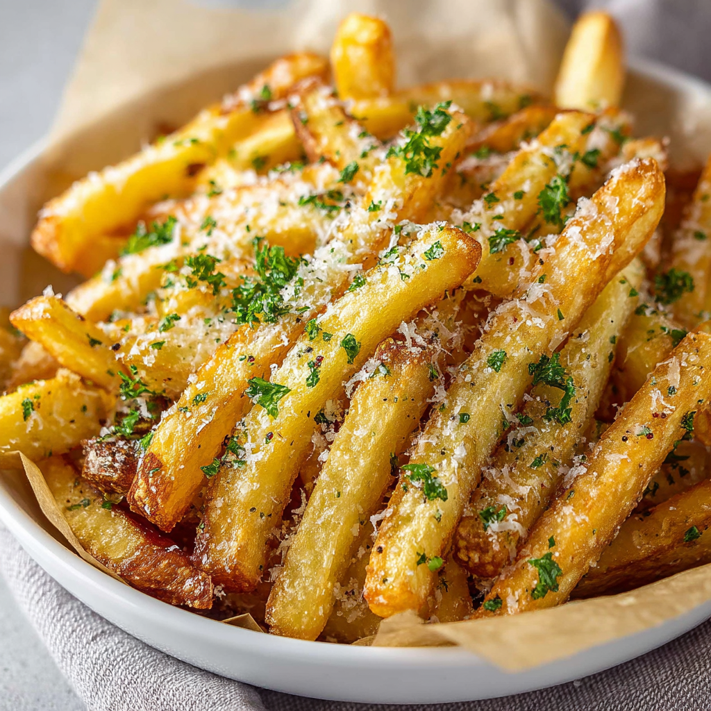 Crispy Garlic Parmesan French Fries — golden fries tossed in garlic butter, parsley, and melted parmesan perfection.