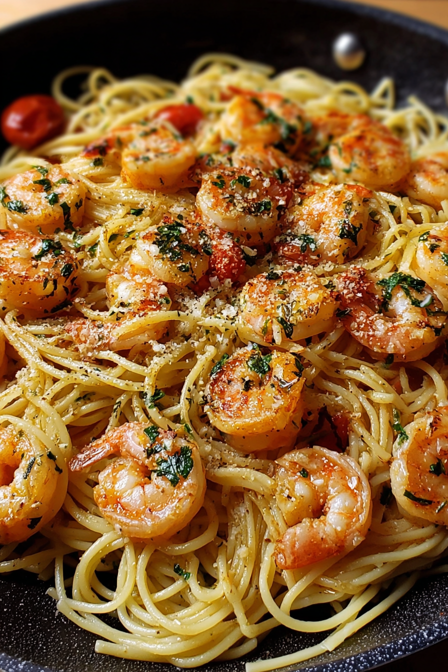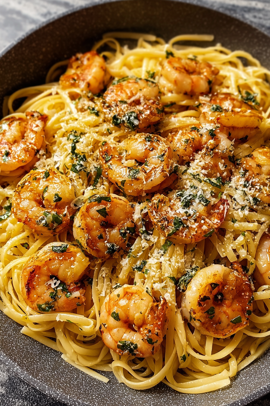 A quick and flavorful pasta dish with succulent garlic-infused shrimp, perfect for a weeknight dinner.