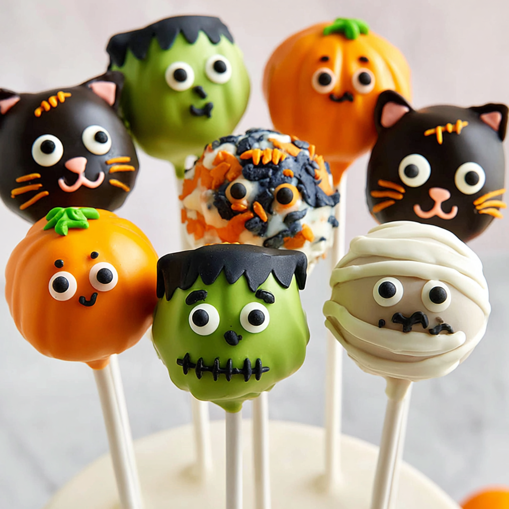 These Halloween Cake Pops are made from moist chocolate fudge cake, shaped into balls, dipped in colorful candy coatings, and decorated as ghosts, pumpkins, and monsters. They’re fun to make, perfect for parties, and guaranteed to impress!