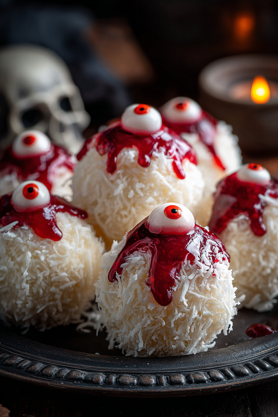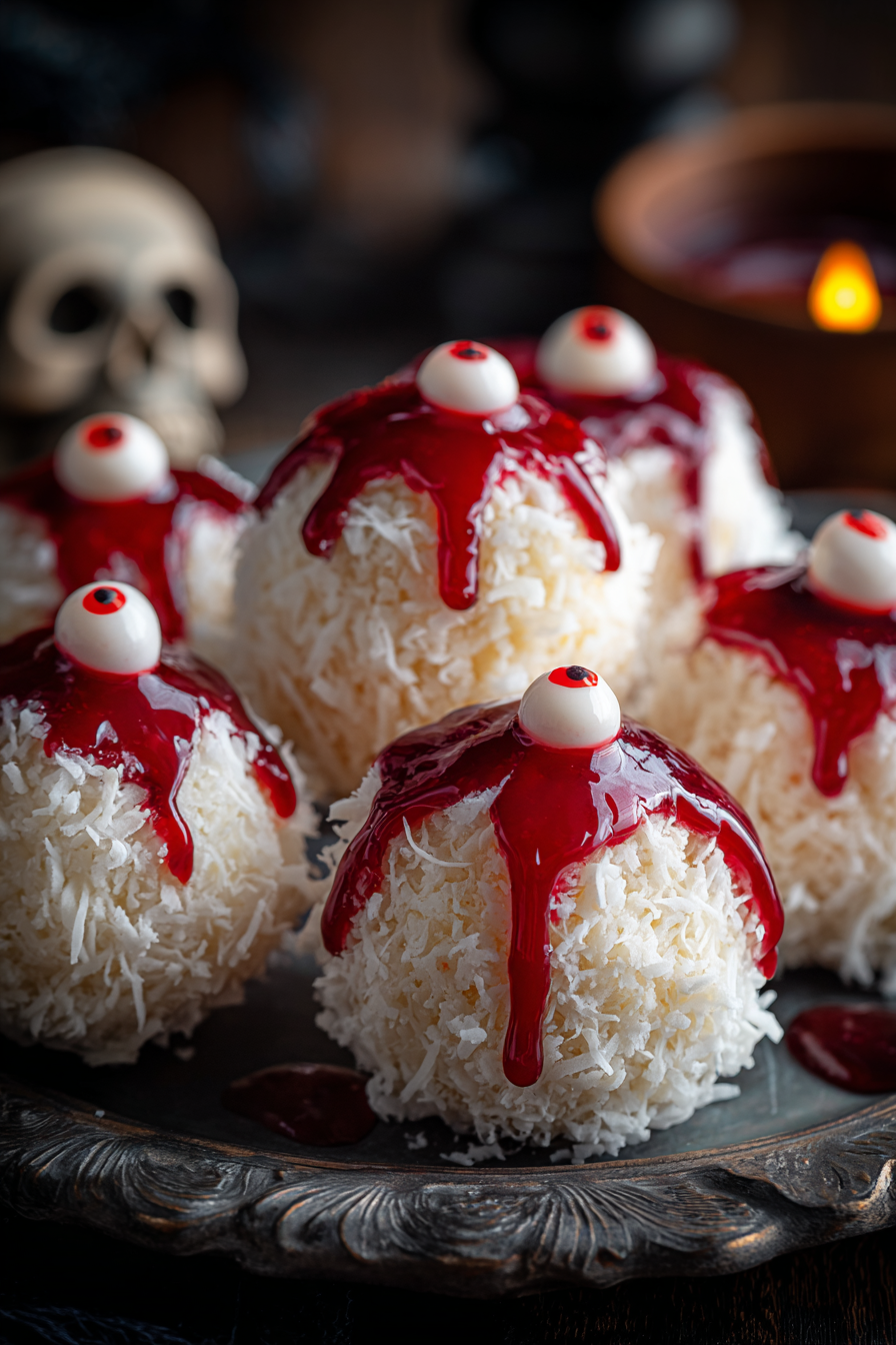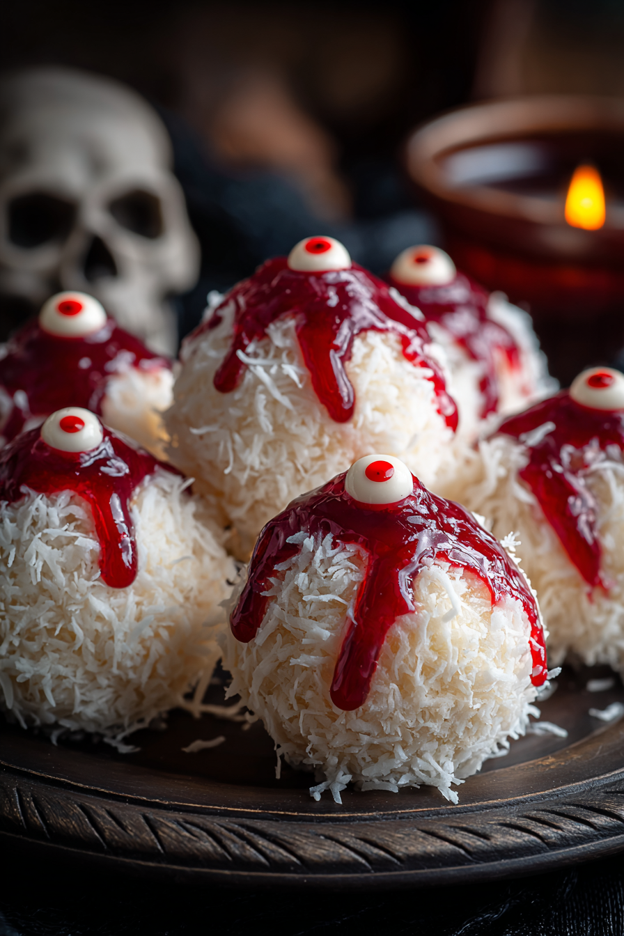 These spooky bite-sized treats combine chewy coconut, rich chocolate, and a surprise candy center. Perfect for Halloween parties or dessert tables.