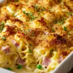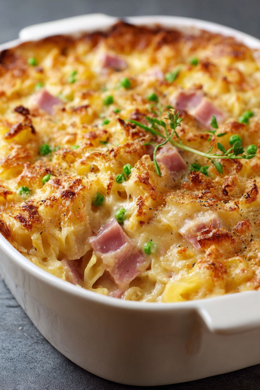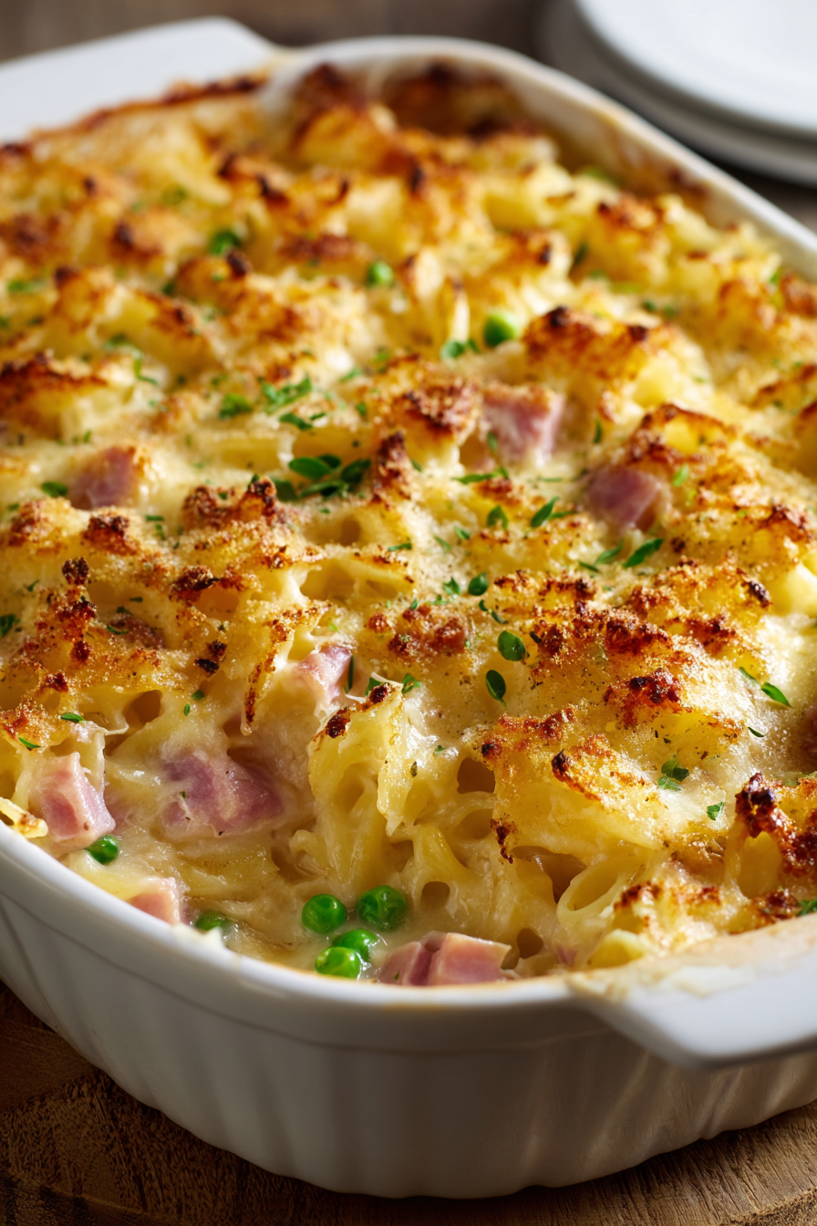 A creamy, cheesy casserole made with tender egg noodles, savory ham, Swiss cheese, and peas. Perfect for using up leftover ham and feeding the family with ease.