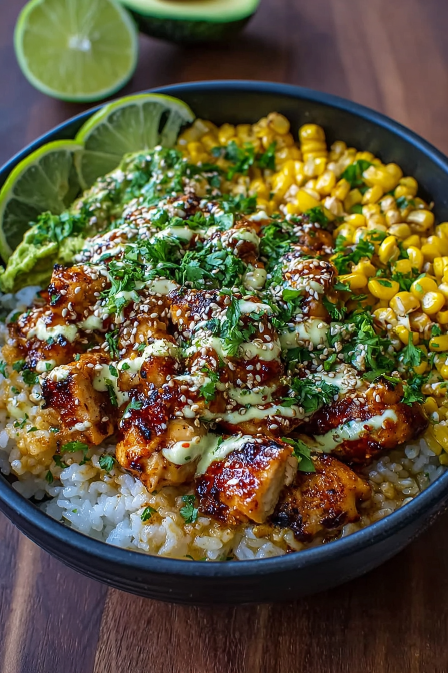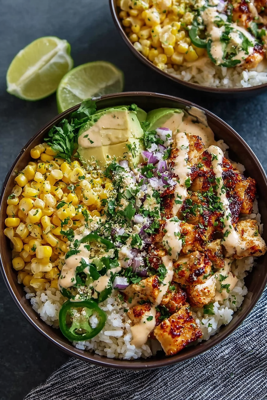 - Assemble the bowls: Divide the rice among bowls, top with cooked chicken, roasted corn, and a drizzle of the creamy sauce. Add avocado slices, cotija cheese, cilantro, and lime wedges as garnish. Serve immediately for maximum flavor and freshness.