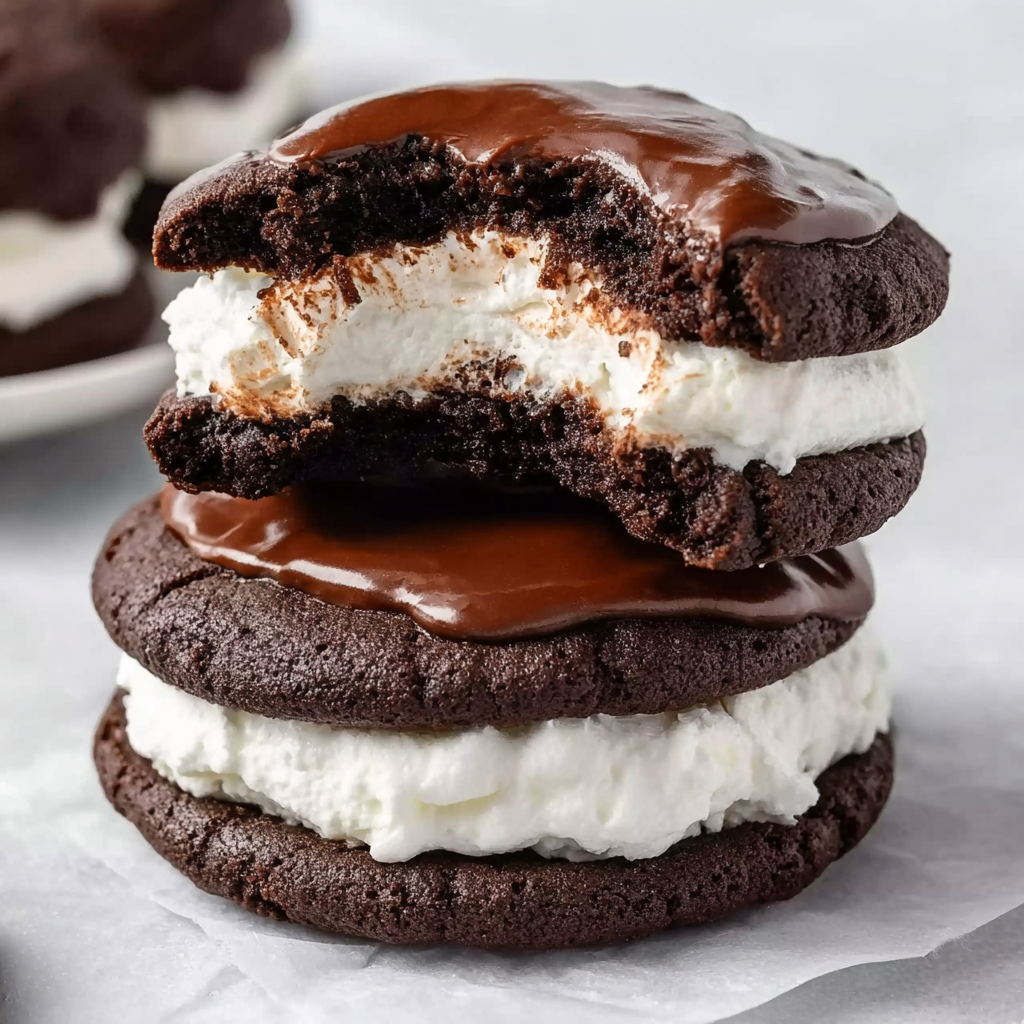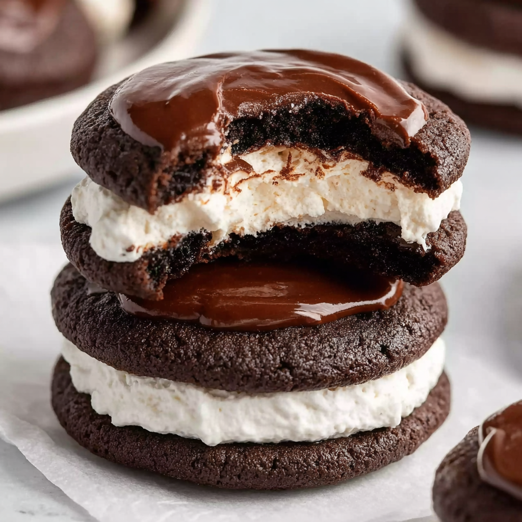 If you adore the nostalgic charm of classic Hostess Cupcakes—the soft chocolate cake, the sweet marshmallow filling, the shiny ganache, and that iconic white swirl—then these Hostess Cupcake Cookies will quickly become one of your favorite baking projects. These cookies bring together everything people love about the beloved packaged treat, but in a fresher, richer, homemade format. Imagine a thick, chewy chocolate cookie base made with Dutch-process cocoa for a deep, luxurious flavor. Add on a swirl of fluffy marshmallow frosting, coat it in glossy chocolate ganache, and finish with the signature white icing loop. The final cookies look just like mini Hostess Cupcakes, but offer all the texture and flavor benefits of a homemade dessert.