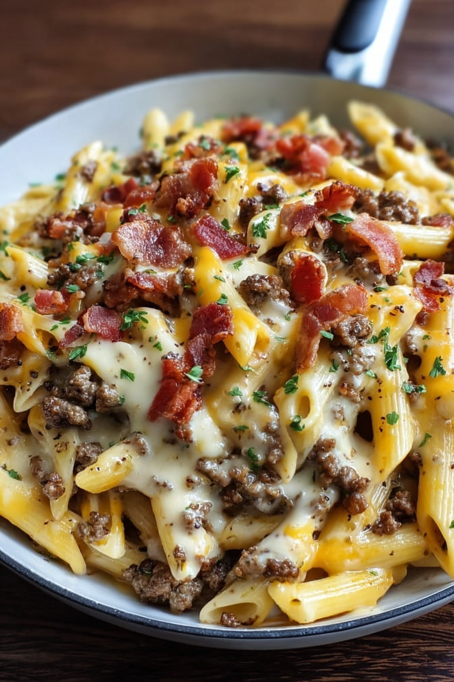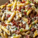 Growing up, I always looked forward to weekend cookouts where bacon cheeseburgers were a highlight. The smoky bacon, sizzling beef, and melted cheese were unbeatable. Years later, while experimenting in the kitchen, I thought—why not bring those flavors into pasta form? That’s how this Loaded Bacon Cheeseburger Alfredo Pasta was born.