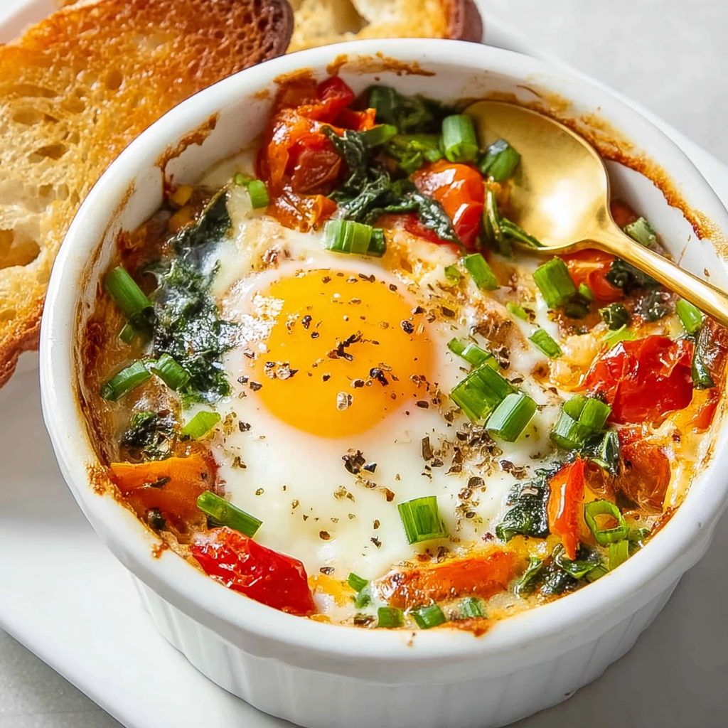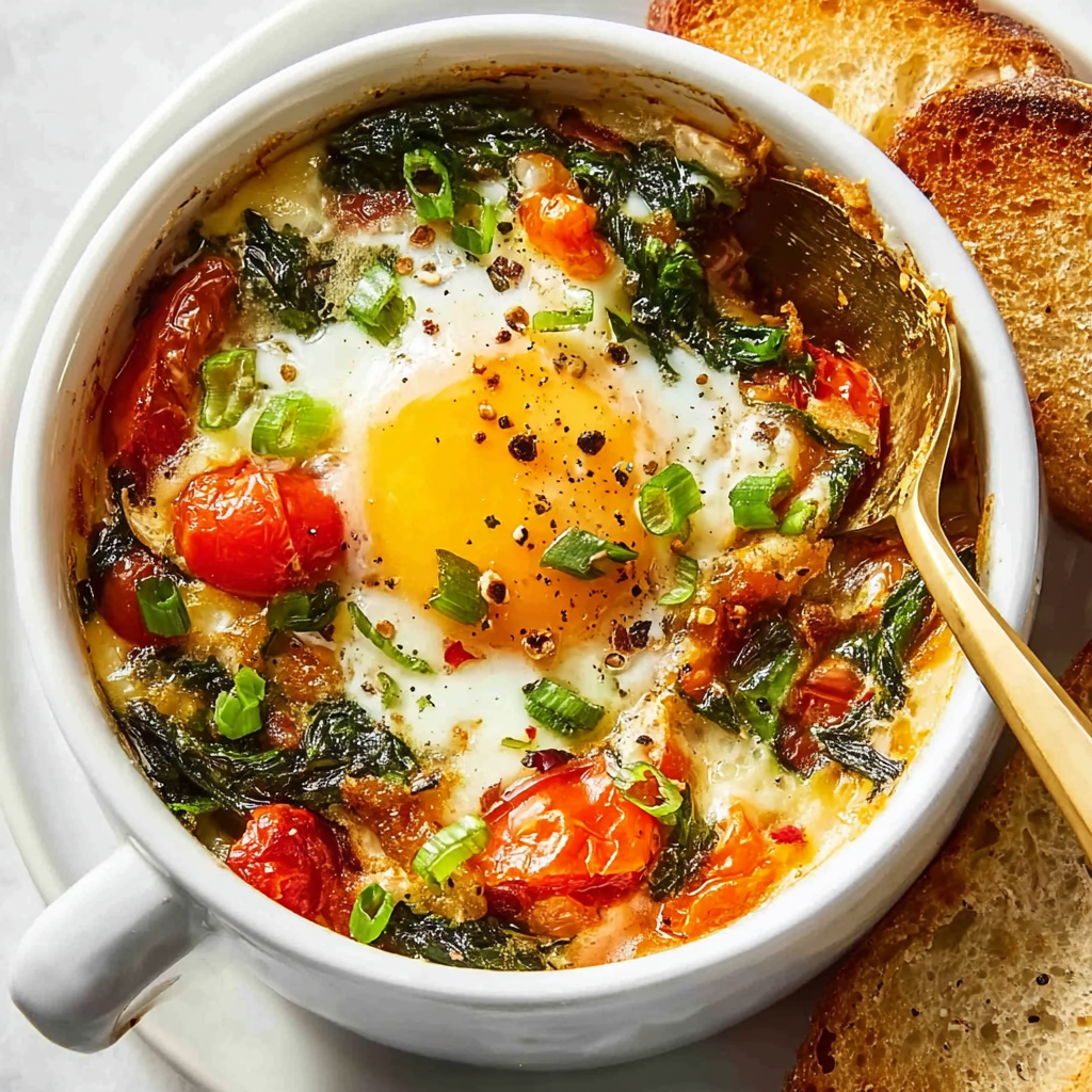 What makes this dish shine is its balance: the baked tomatoes burst into sweet, jammy perfection, blending with crumbled feta and olive oil to form a creamy, flavorful base. Then, the eggs bake gently in that luscious mixture, absorbing the tang and saltiness of the cheese. The red onion and garlic add depth, while oregano, thyme, and red pepper flakes bring that Mediterranean flair. It’s hearty enough for breakfast but also works beautifully for lunch or dinner with a side of toasted sourdough or pita.
