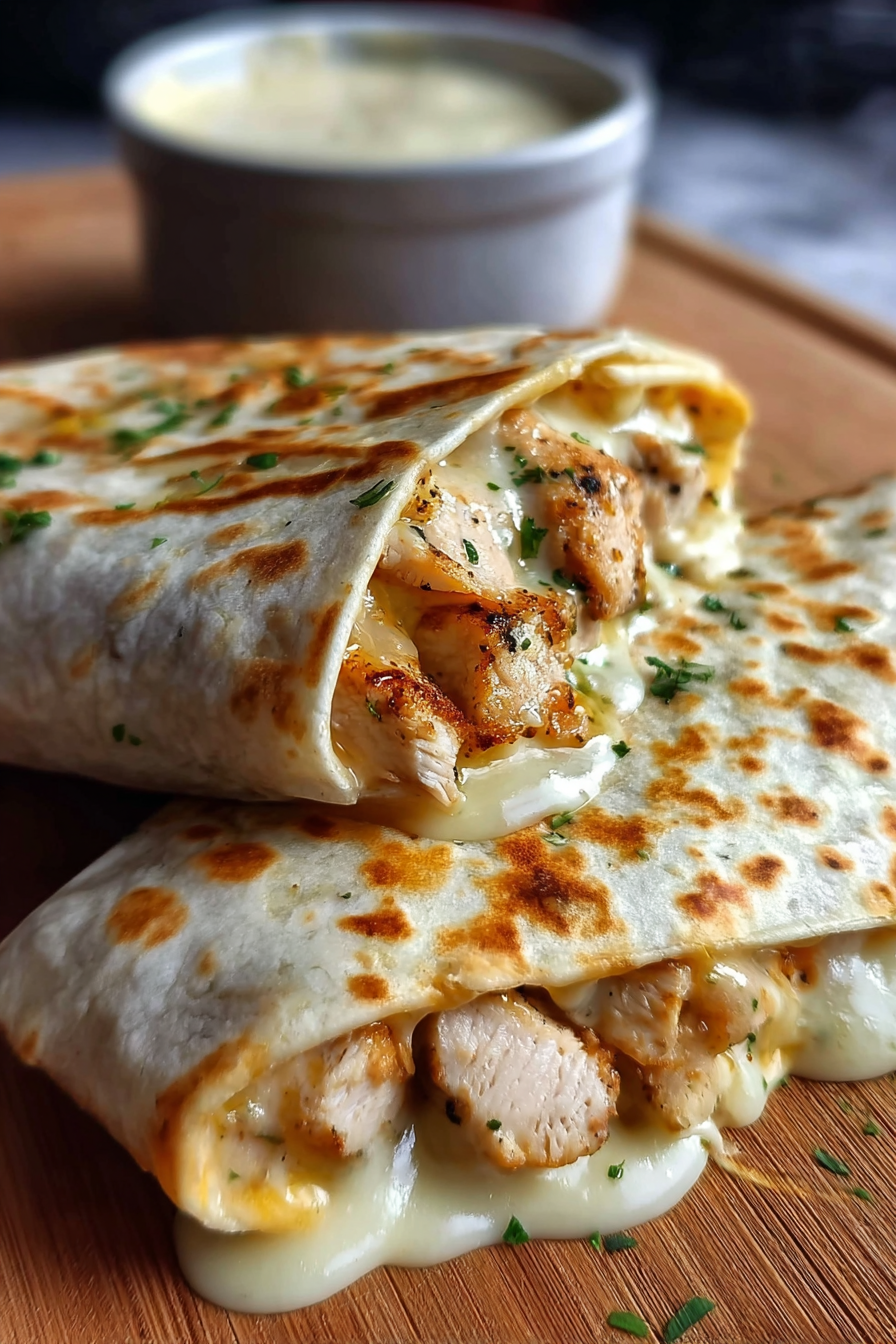 Cheesy, garlicky, and packed with juicy chicken, these tortilla wraps are quick to make and perfect for lunch, dinner, or snacks.