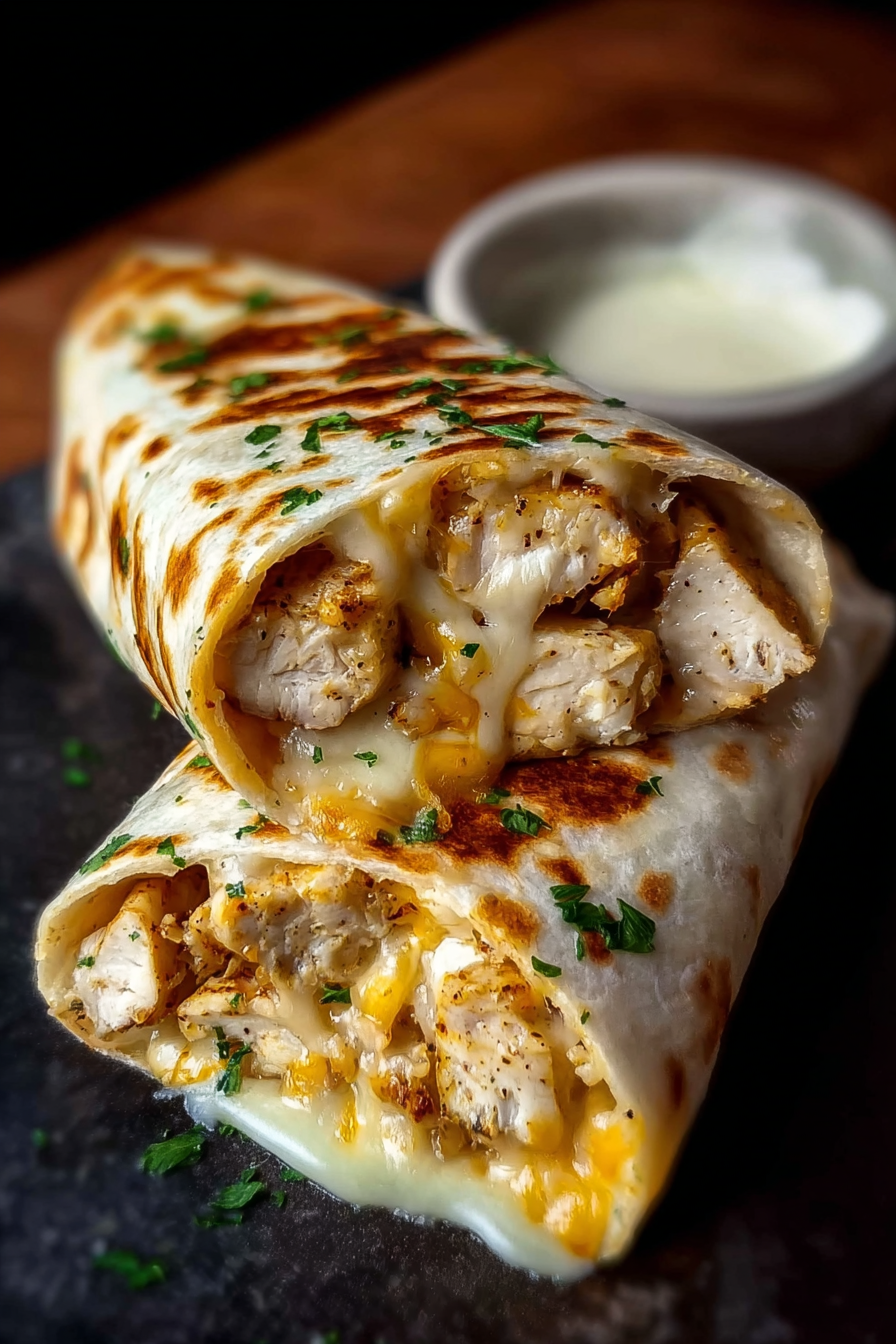 Cheesy, garlicky, and packed with juicy chicken, these tortilla wraps are quick to make and perfect for lunch, dinner, or snacks.