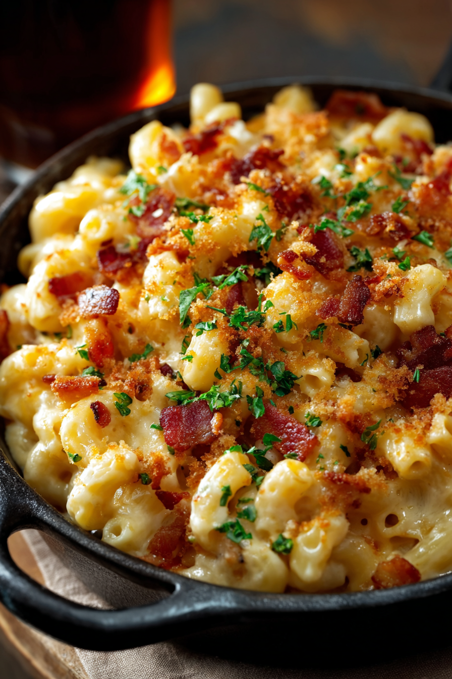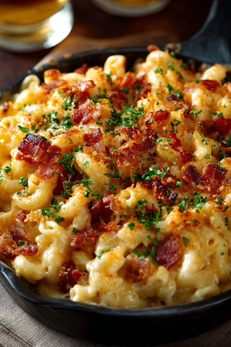 - Bake or serve: If baking, place in a preheated oven at 375°F (190°C) for 20–25 minutes until golden and bubbly. Otherwise, serve immediately straight from the stovetop, garnished with parsley or extra bacon bits.