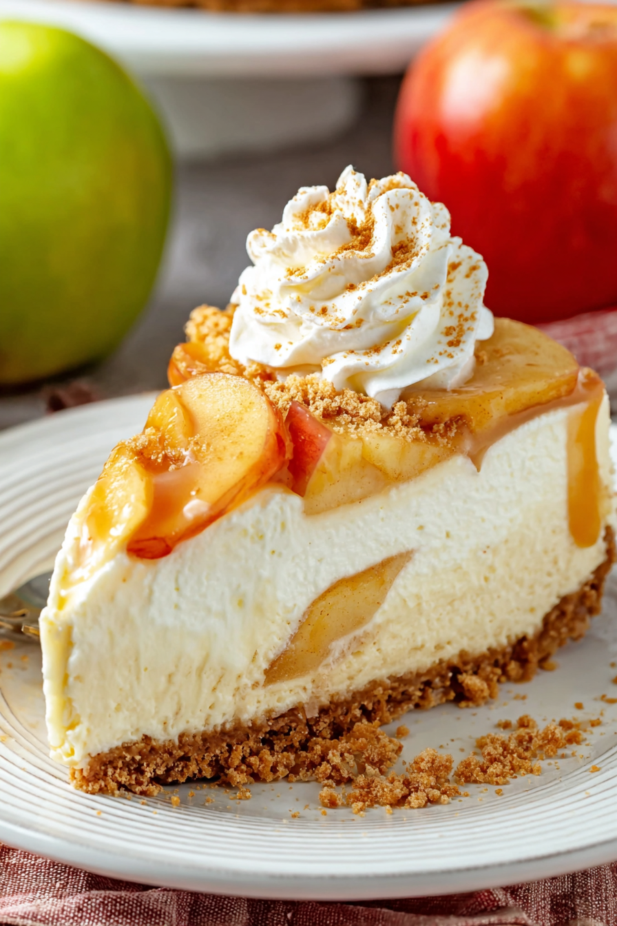 Creamy no-bake cheesecake layered with spiced caramelized apples and a buttery graham cracker crust. Perfect for fall gatherings or holidays.
