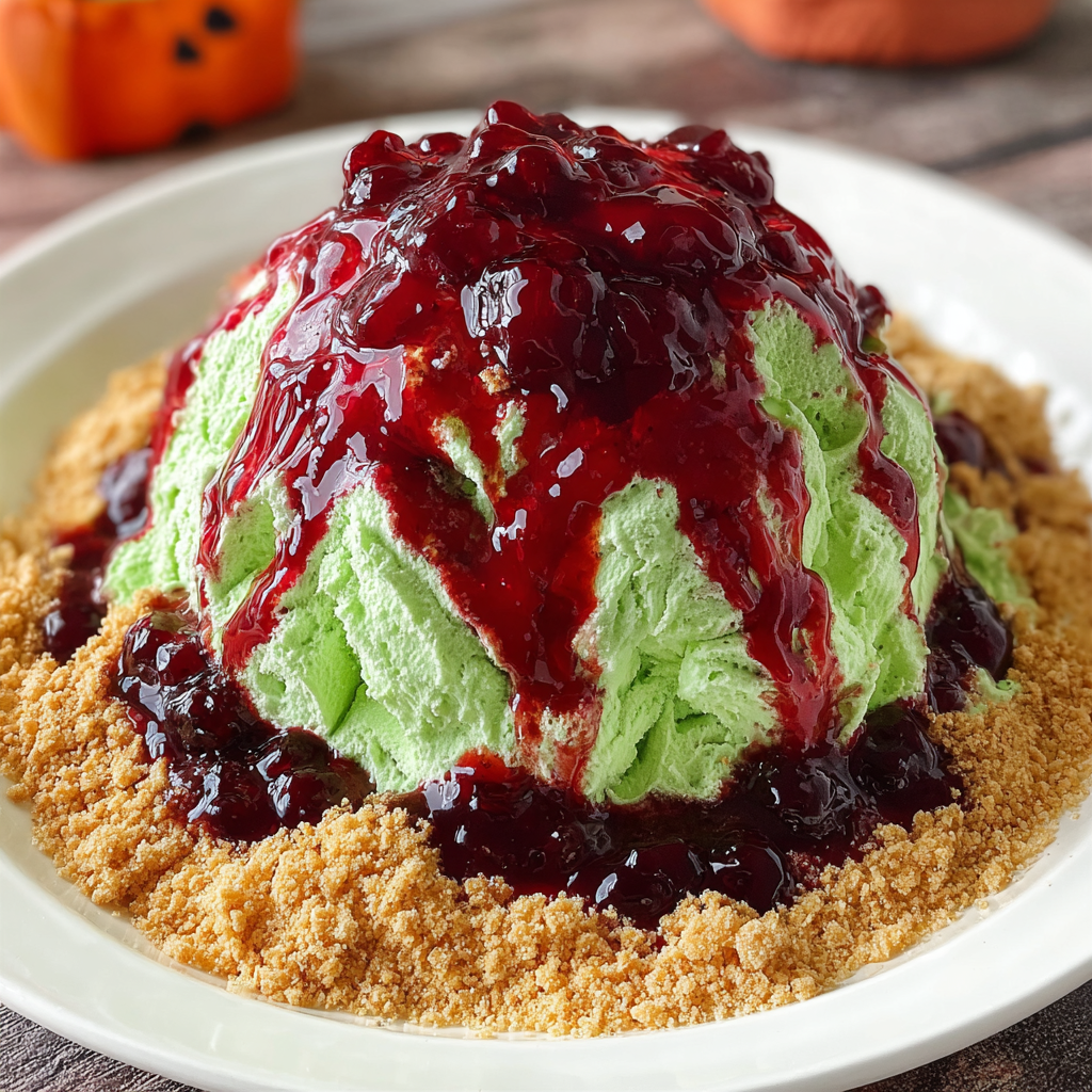 For an even eerier look, drizzle a few spoonfuls of cherry pie filling through the green cheesecake before chilling. Use a knife to swirl gently, creating a marbled, brain-like effect. When you top it with more cherry filling later, the layered color will look terrifyingly realistic!