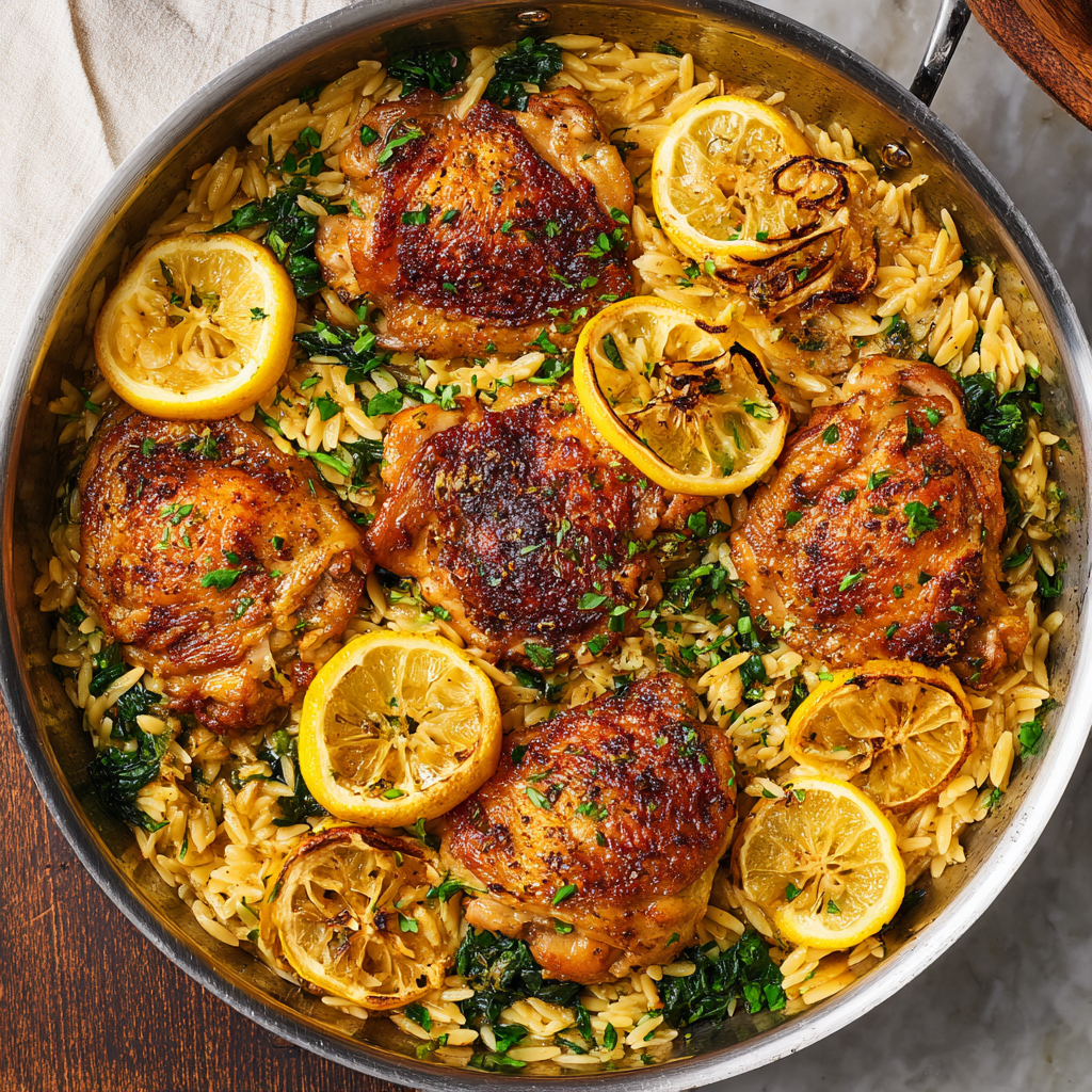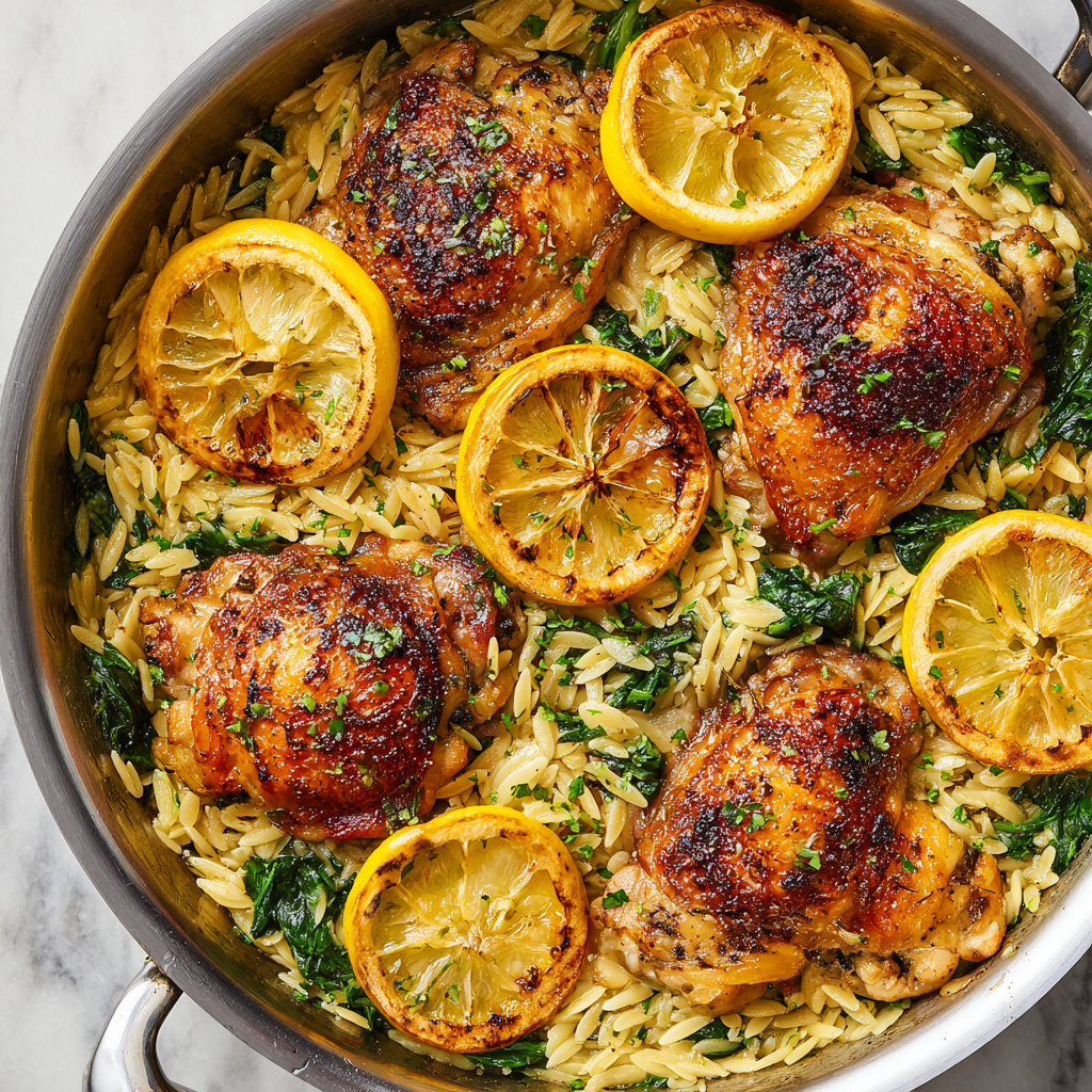 If there’s one kind of dinner that consistently wins over busy cooks and comfort-food lovers alike, it’s a well-made One-Pan Lemon Garlic Chicken. This recipe brings together crispy, golden chicken thighs, tender orzo, fresh spinach, and a bright lemon-garlic sauce—all cooked in a single pan for maximum flavor and minimal cleanup. It’s the kind of dish that feels both rustic and refined, making it perfect for weeknight dinners or casual entertaining.