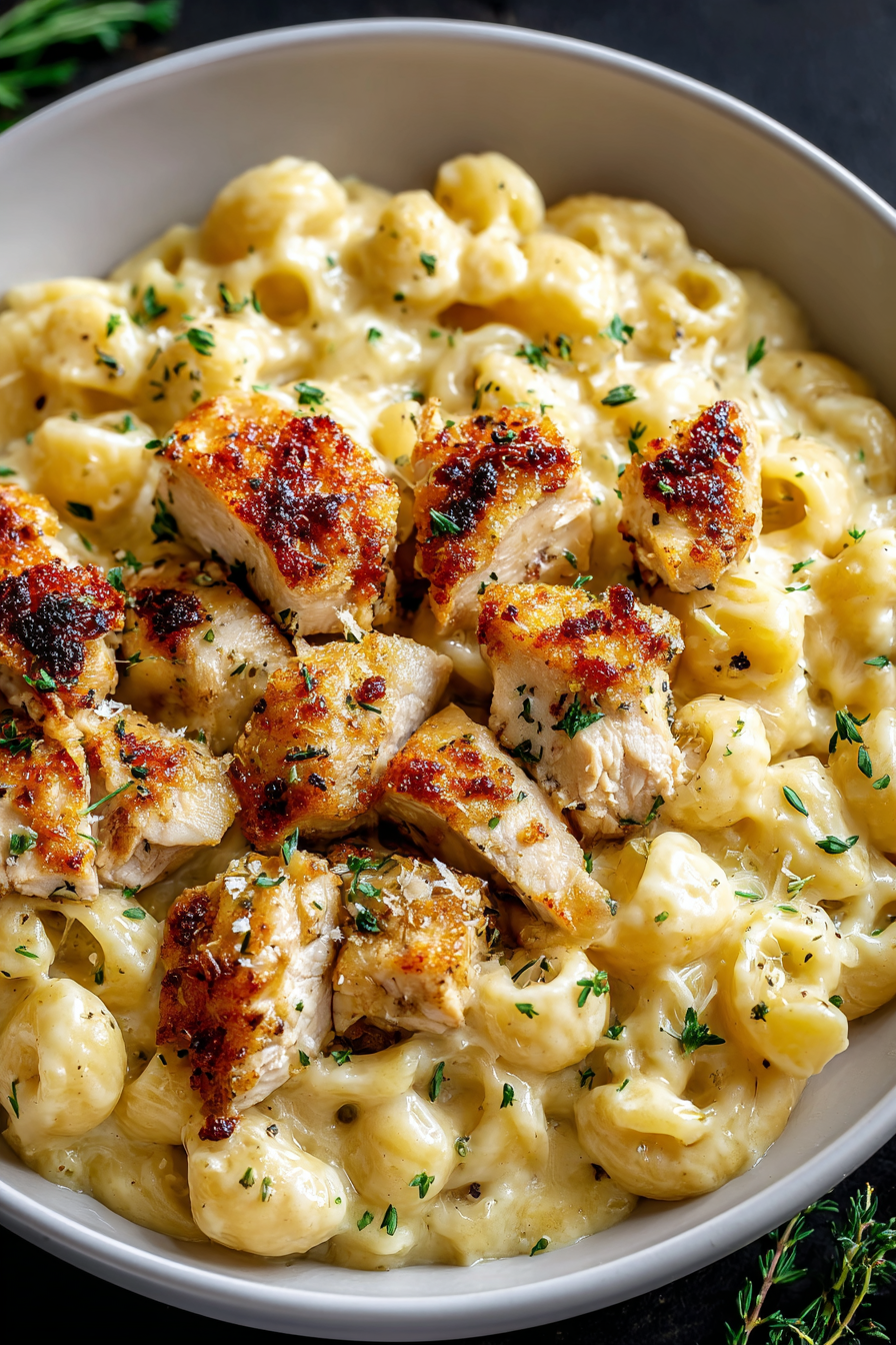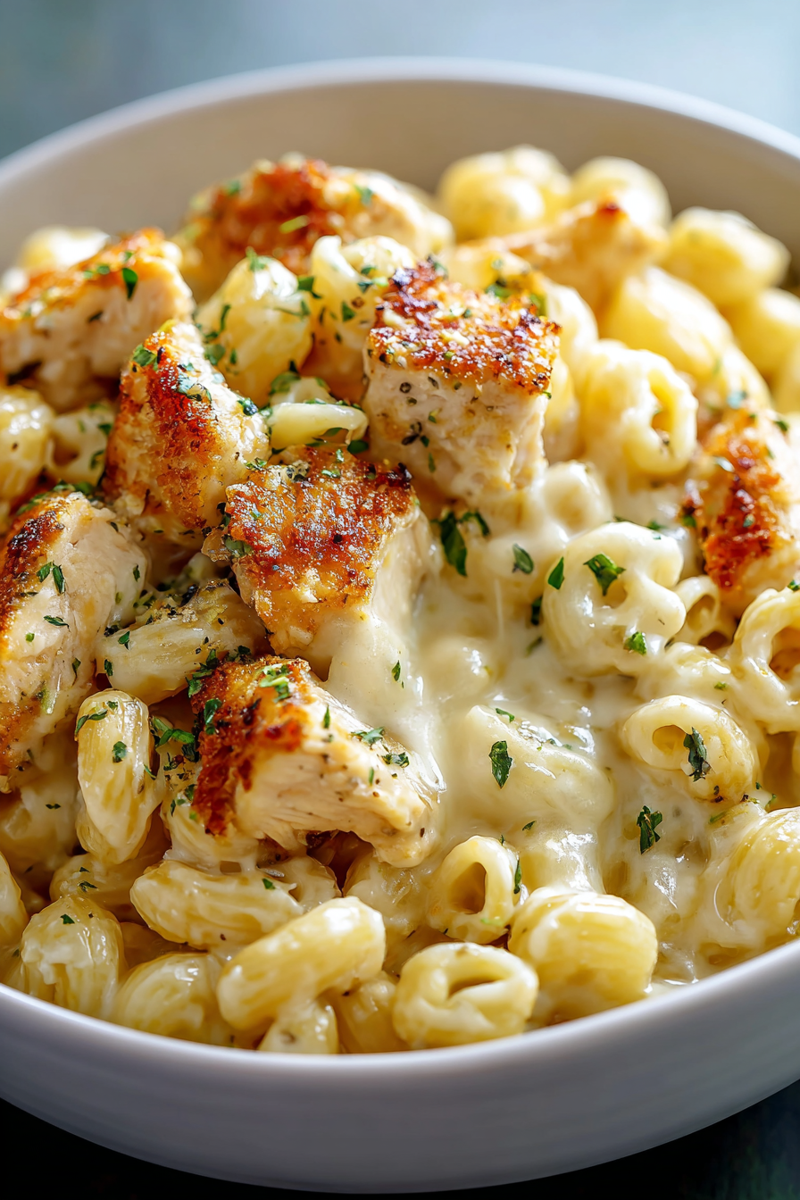 Description: Creamy mac and cheese meets juicy chicken and savory garlic for the ultimate comfort food. Perfect for family dinners or cozy nights in.