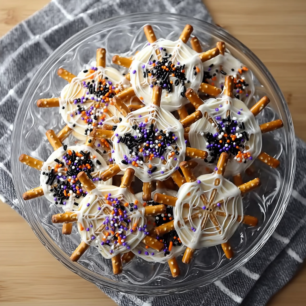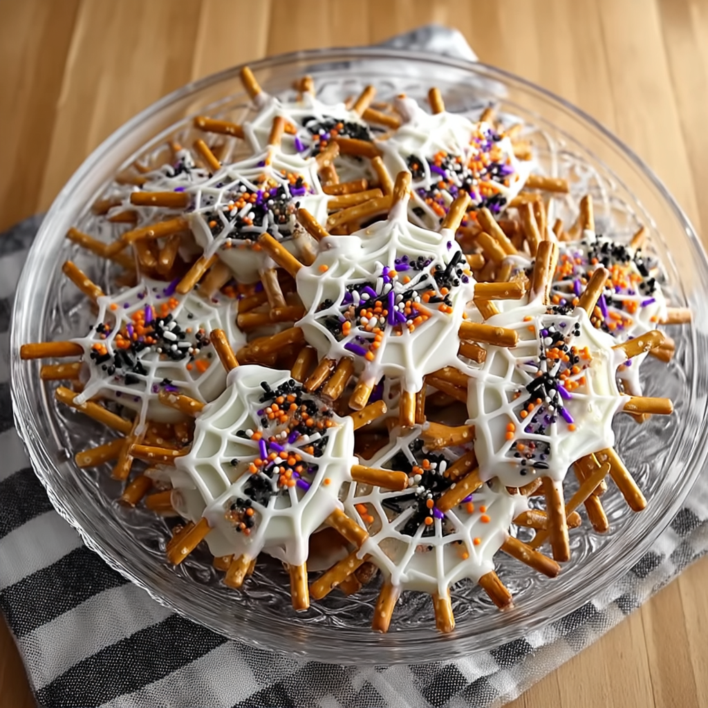 The base of the web comes from crunchy pretzel sticks arranged in a radial pattern. Melted white candy wafers form the intricate spider web, while festive sprinkles add that pop of color and holiday spirit. For an extra-creepy twist, you can top each one with mini chocolate spiders or candy eyeballs. This recipe is highly customizable, allowing you to go full DIY with decorations or keep it classic and simple. It’s perfect for kids and adults alike.