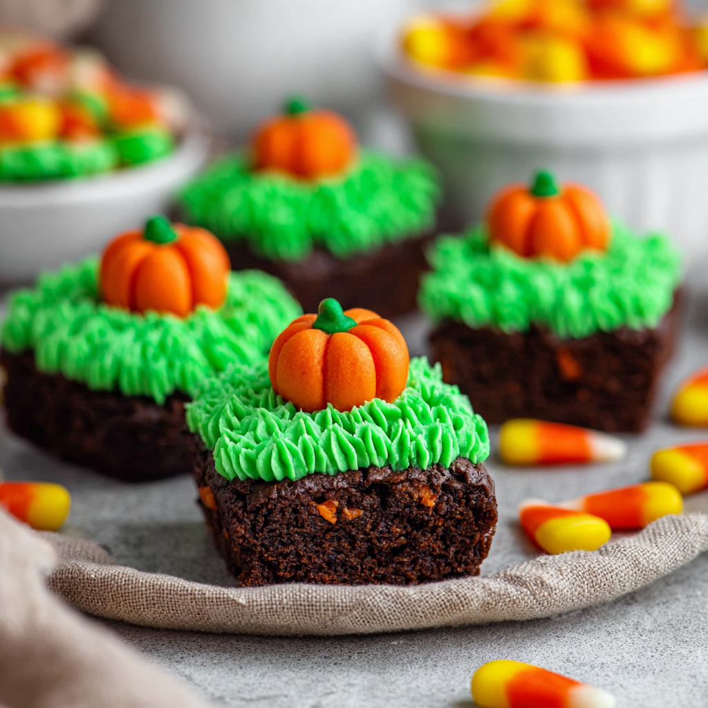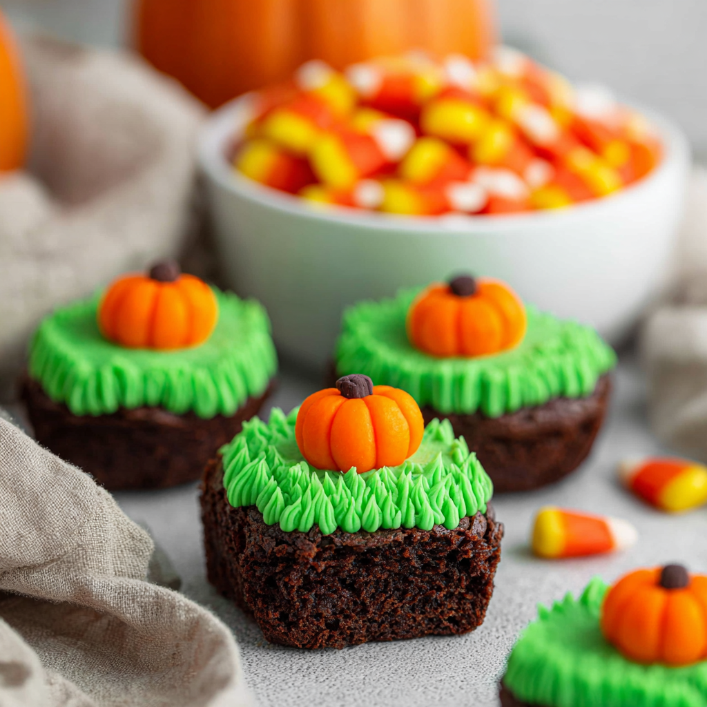 These Pumpkin Patch Brownie Bites are bite-sized chocolate treats topped with green frosting “vines” and candy pumpkins. Quick, cute, and festive—perfect for Halloween parties or fall gatherings!