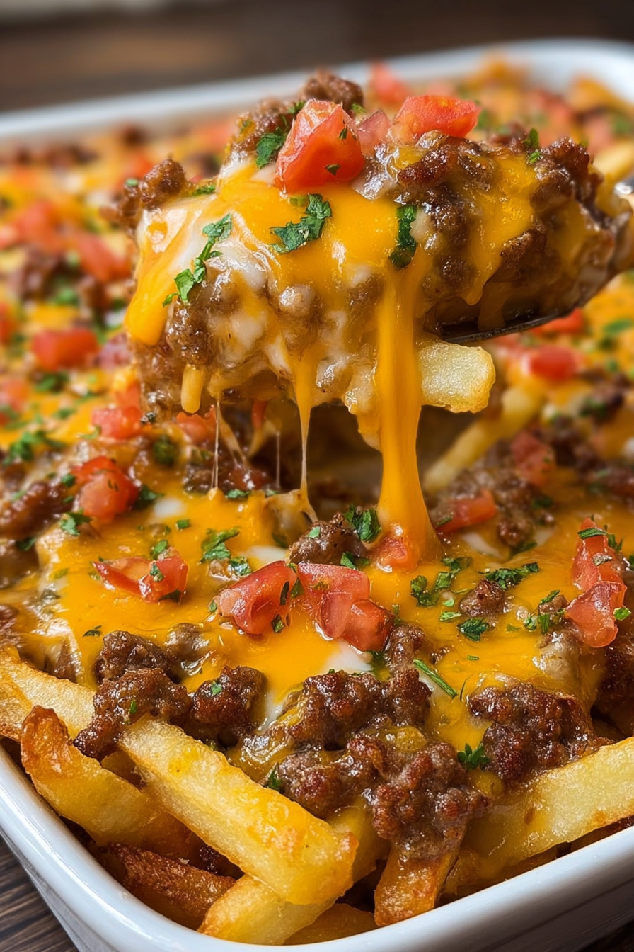 A hearty casserole that combines juicy ground beef, crispy golden fries, and melted cheese for the ultimate comfort food. Perfect for weeknights or casual gatherings