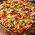 Instant rice acts as the base, absorbing the creamy sauce made from sour cream and cream of chicken soup. This ensures every bite is both flavorful and satisfying. The fajita vegetables—bell peppers and onions—add color, crunch, and a touch of sweetness to balance the richness of the sauce. Seasonings like chili powder, cumin, garlic, and paprika give the dish its signature Tex-Mex flair. And of course, no casserole is complete without a generous topping of shredded cheese, which melts into a golden, bubbly layer of goodness.