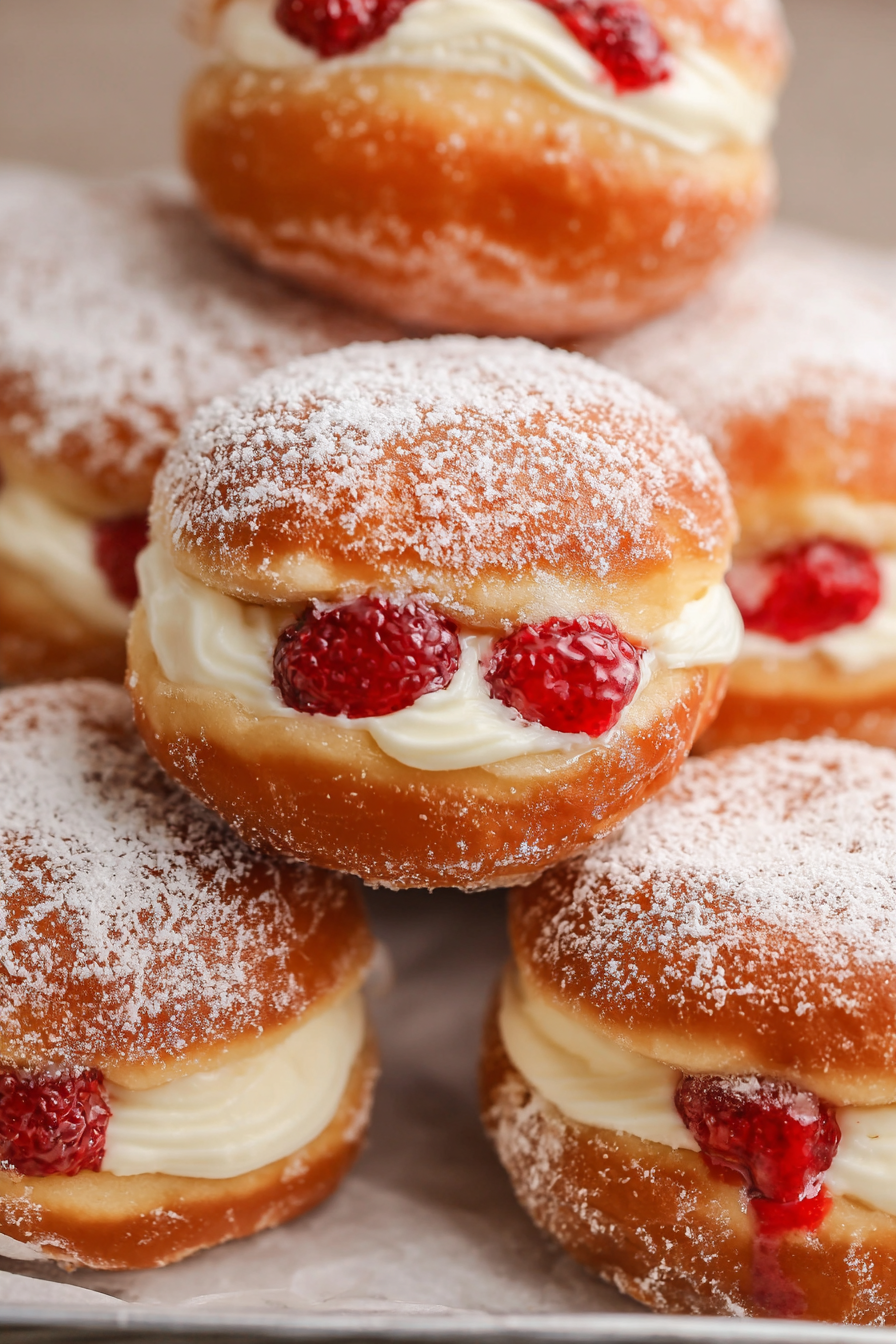 Fluffy yeast-raised donuts filled with creamy cheesecake and topped with a tangy raspberry glaze. A bakery-quality treat you can easily make at home.