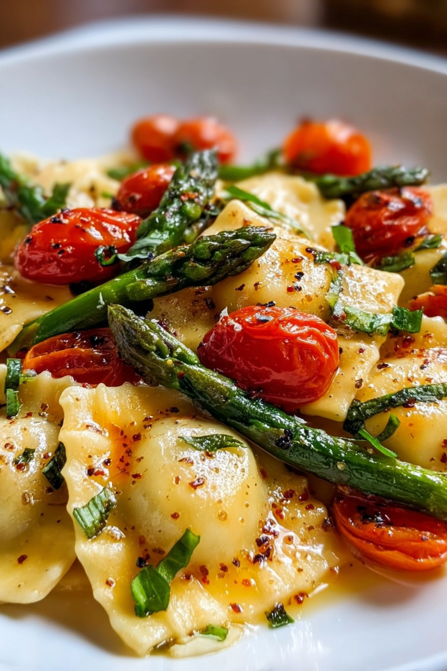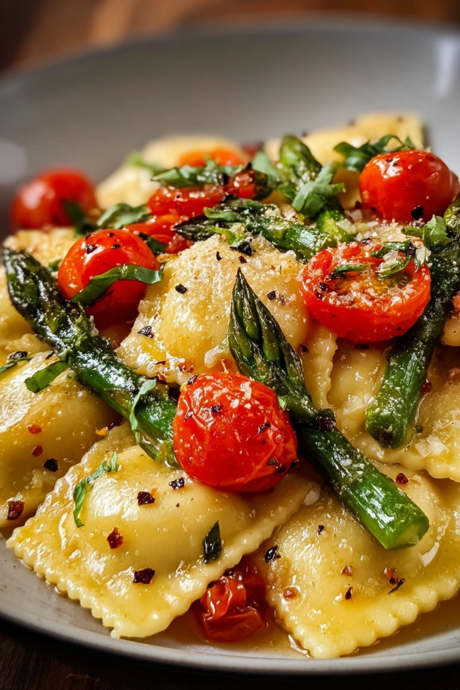 A fresh and vibrant pasta dish with tender ravioli, crisp asparagus, juicy tomatoes, and fragrant garlic-herb flavors. Quick and elegant for any occasion.